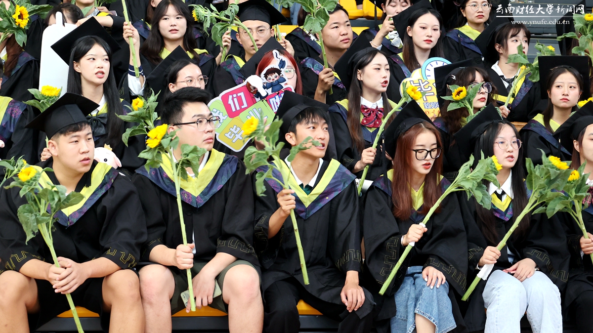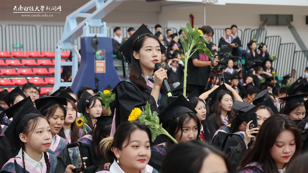 “我会牢牢记住你的脸,我会珍惜你给的思念,这些日子在我心中永远都不会抹去……”典礼开始前的热身接力合唱环节,每名毕业生都获得了一支象征着“向阳而生、逐光前行”的向日葵,每个主动接过话筒领唱的同学都获得了一份来自云财的“神秘礼物”。