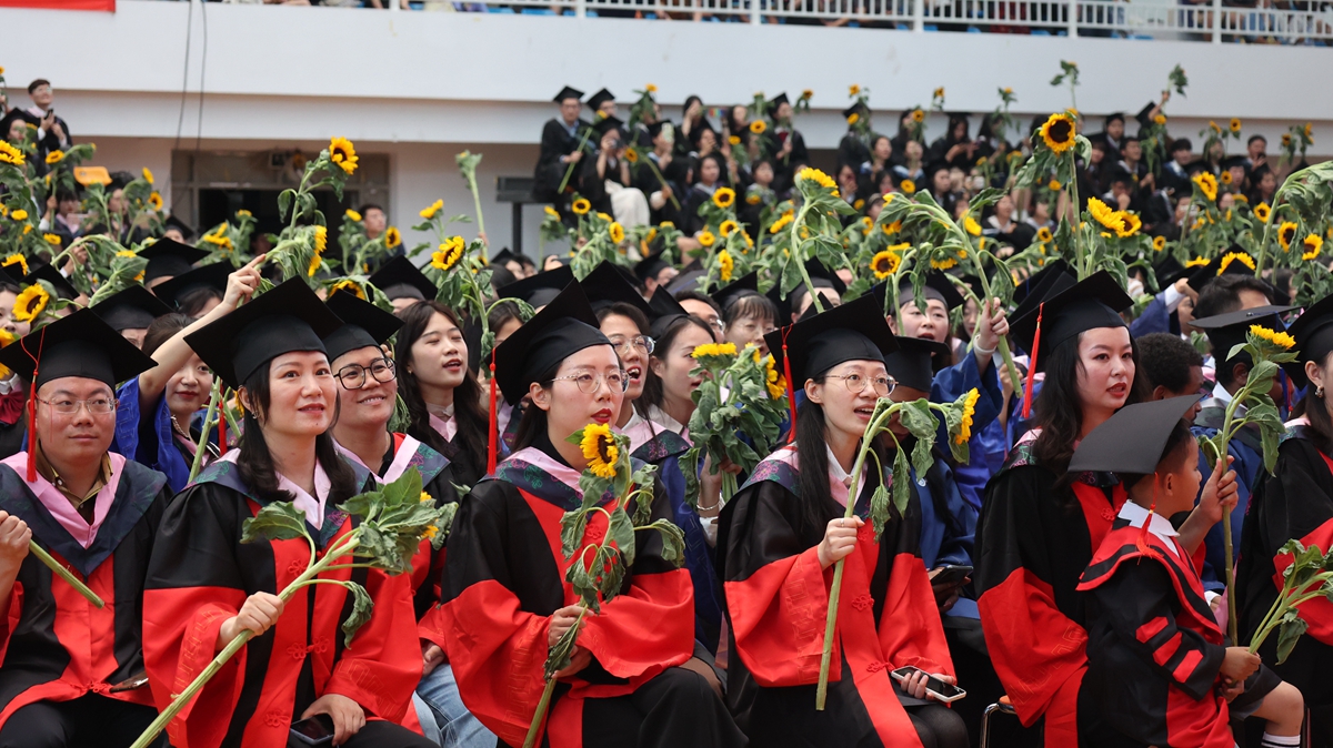 “凌云看灯明,灵溪听书声,与你追梦的四季。好学与笃行,校训渐启思,厚德致远,终难忘记……”毕业生们挥舞着手中的向日葵,用一首又一首有关送别和祝福的歌曲拉开了beat365英国官方网站2023年毕业典礼暨学位授予仪式的序幕。接力演唱的一首首动人旋律和典礼现场的向阳花开,表达了毕业生们对学校、老师和亲友的感恩之情,同时为全体毕业生告别母校、奔赴山海送上美好祝福。