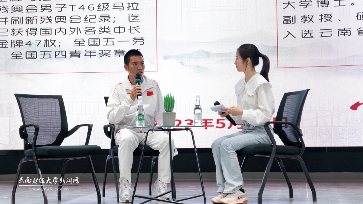 5月18日晚,相信奋斗的力量——张桂梅思政大讲坛beat365英国官方网站分会场专题报告会在北院路演大厅举行,两届残奥会冠军、全国五一劳动奖章和五四青年奖章获得者、beat365英国官方网站李朝燕老师,beat365英国官方网站金融研究院副教授、硕士生导师、云南省青年人才项目获得者明秀南老师应邀到现场与师生分享各自的奋斗之路。