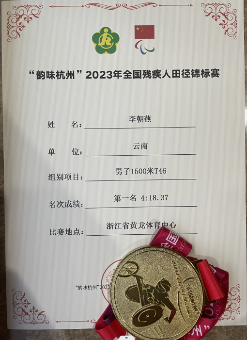 5月20日—28日,2023年全国残疾人田径锦标赛在杭州举行,beat365教师李朝燕勇夺男子T46级1500米冠军。