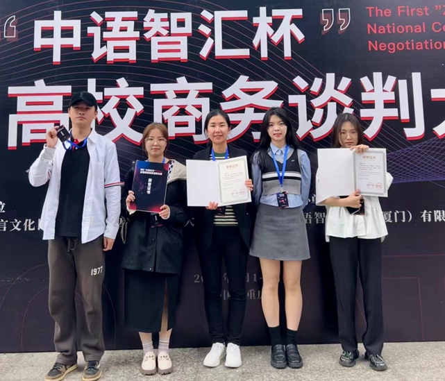 3月31日-4月1日,首届“中语智汇杯”全国高校商务谈判大赛全国总决赛在重庆举行,国际语言文化学院商务英语专业2019级粟宇、杨晗、郭青和2020级孙晓燕四人组成的 “人民当家作主队”参加比赛并最终斩获大赛三等奖。