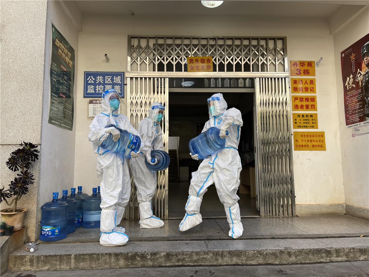 连日来,累计100余名党员、教职工志愿者逆行出征,进入北院校园,加入这场“稳住保障、控住疫情、保住稳定”的关键战役。平日里,他们是老师,是干部。现在,他们是“大白”、是送水工、是配餐员、是送餐员、是宣传员、是检测员……他们深入每一栋每一层宿舍楼,排查校园的每个角落,知难而进,确保完成检测、值守、生活保障、应急处置等各项任务,通过引导师生、组织师生、凝聚师生,以快制快,提升防疫工作质量和效率。