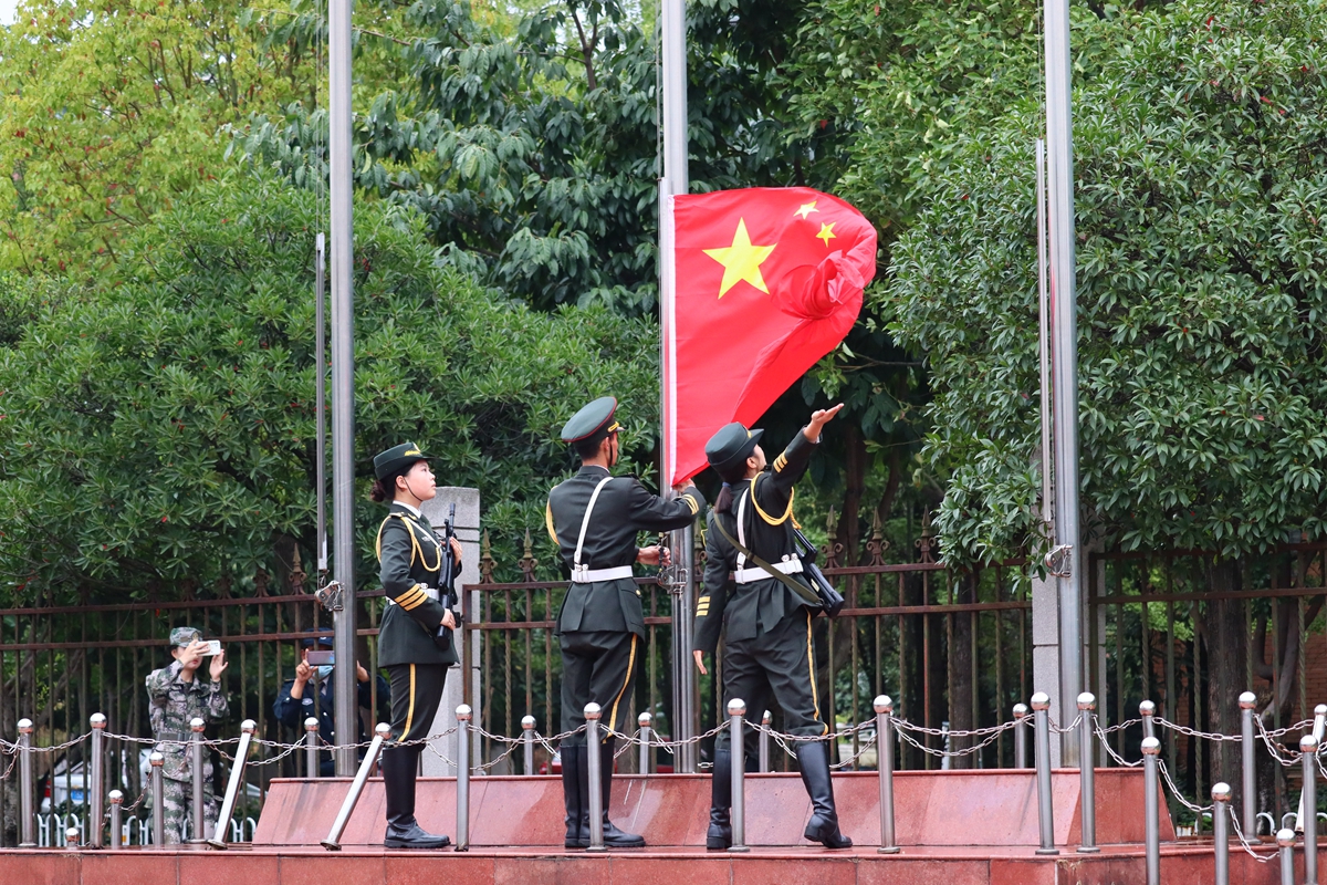 “齐步——走”嘹亮高昂的口号声起,身着礼服的国旗护卫队迈着铿锵有力、整齐划一的步伐向着升旗台进发。他们朝气蓬勃、斗志昂扬,怀着崇高的敬意,将鲜艳的五星红旗护送至升旗台。庄严的国歌前奏响起,升旗手将手中紧握的国旗用力抛向空中,五星红旗迎风舒展,随着国歌缓缓上扬,所有人高唱国歌,向冉冉升起的国旗行注目礼,现场庄严肃穆、群情激昂。