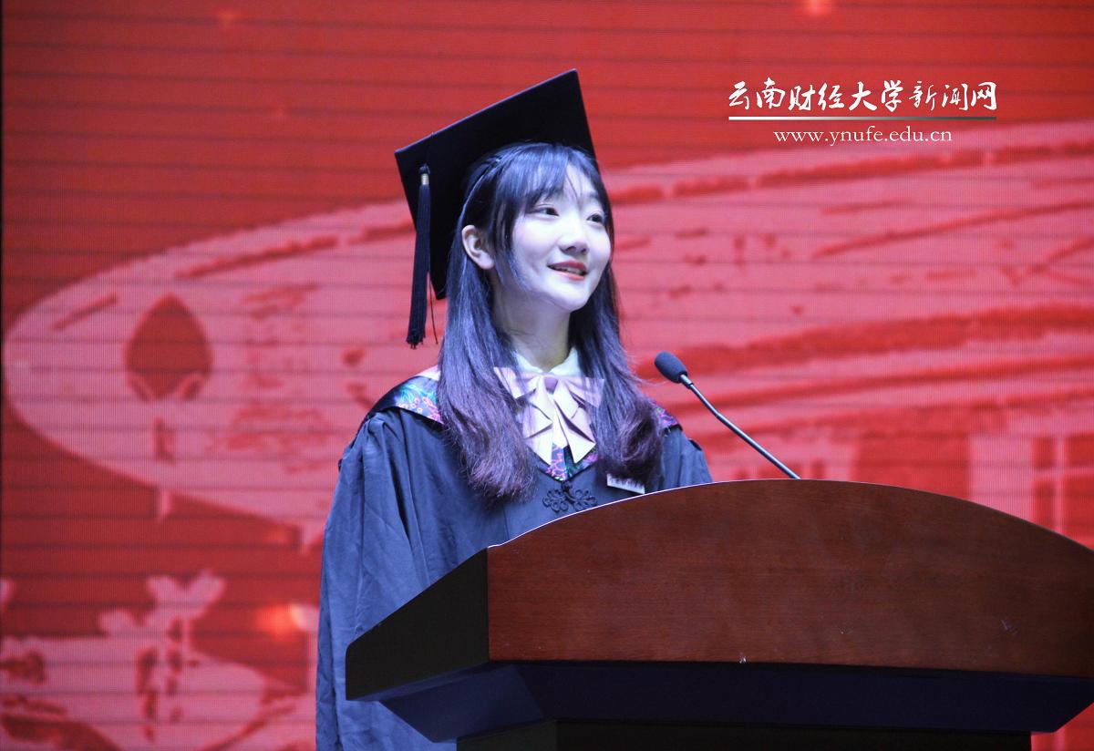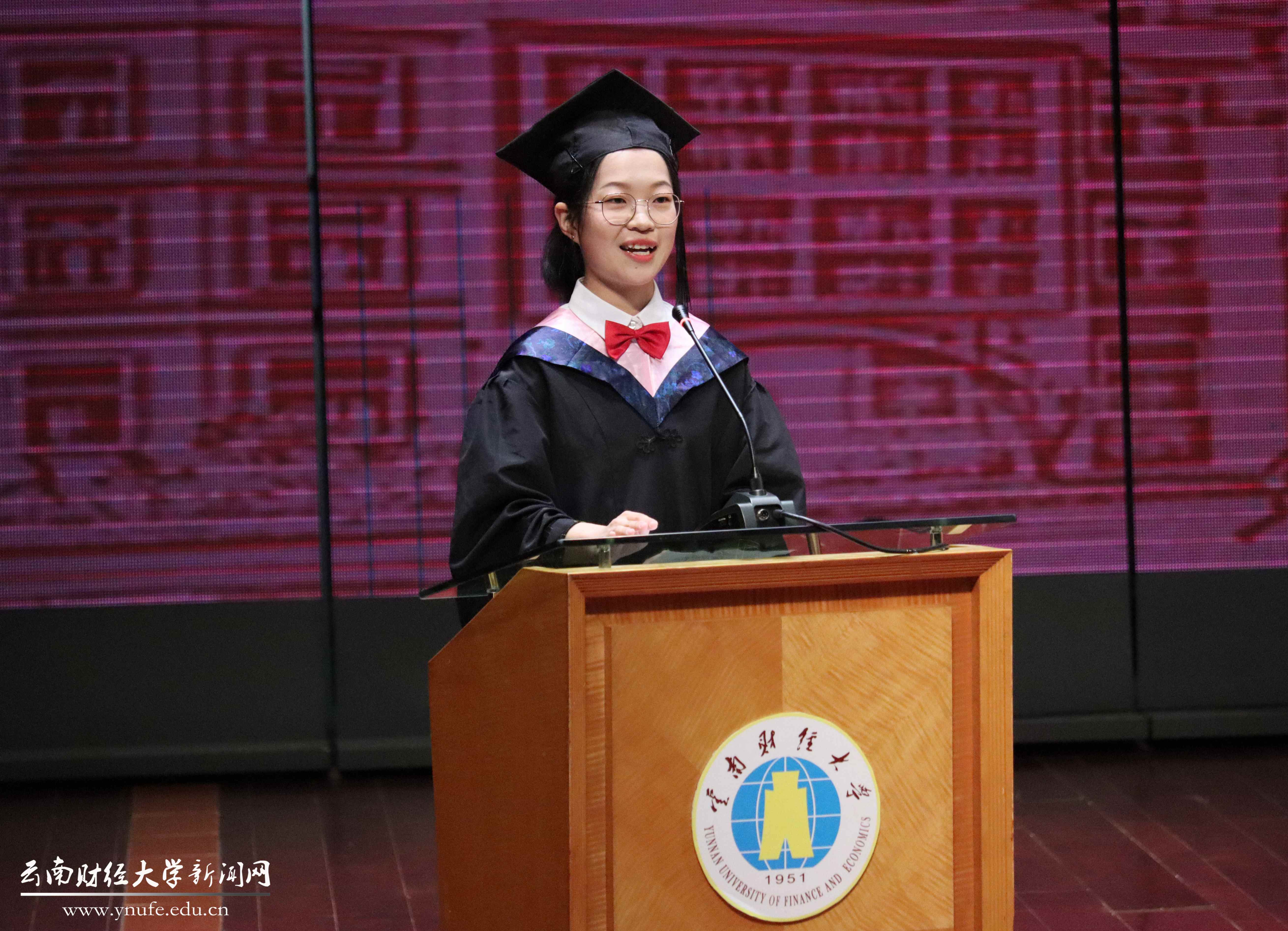 本科生代表、来自国际语言文化学院英语18-1班的尉俊莹同学表示,从今以后,无论是继续深造,还是走向社会,都要昂首挺胸,脚踏实地秉承“好学笃行 厚德致远”的云财校训,践行“自强不息 敢为人先”的云财精神。旅游与酒店管理学院的杨芷婷同学表示,作为云财学子,无论身处何方,定将不负时代、不负韶华,努力成为堪当民族复兴大任的时代新人。