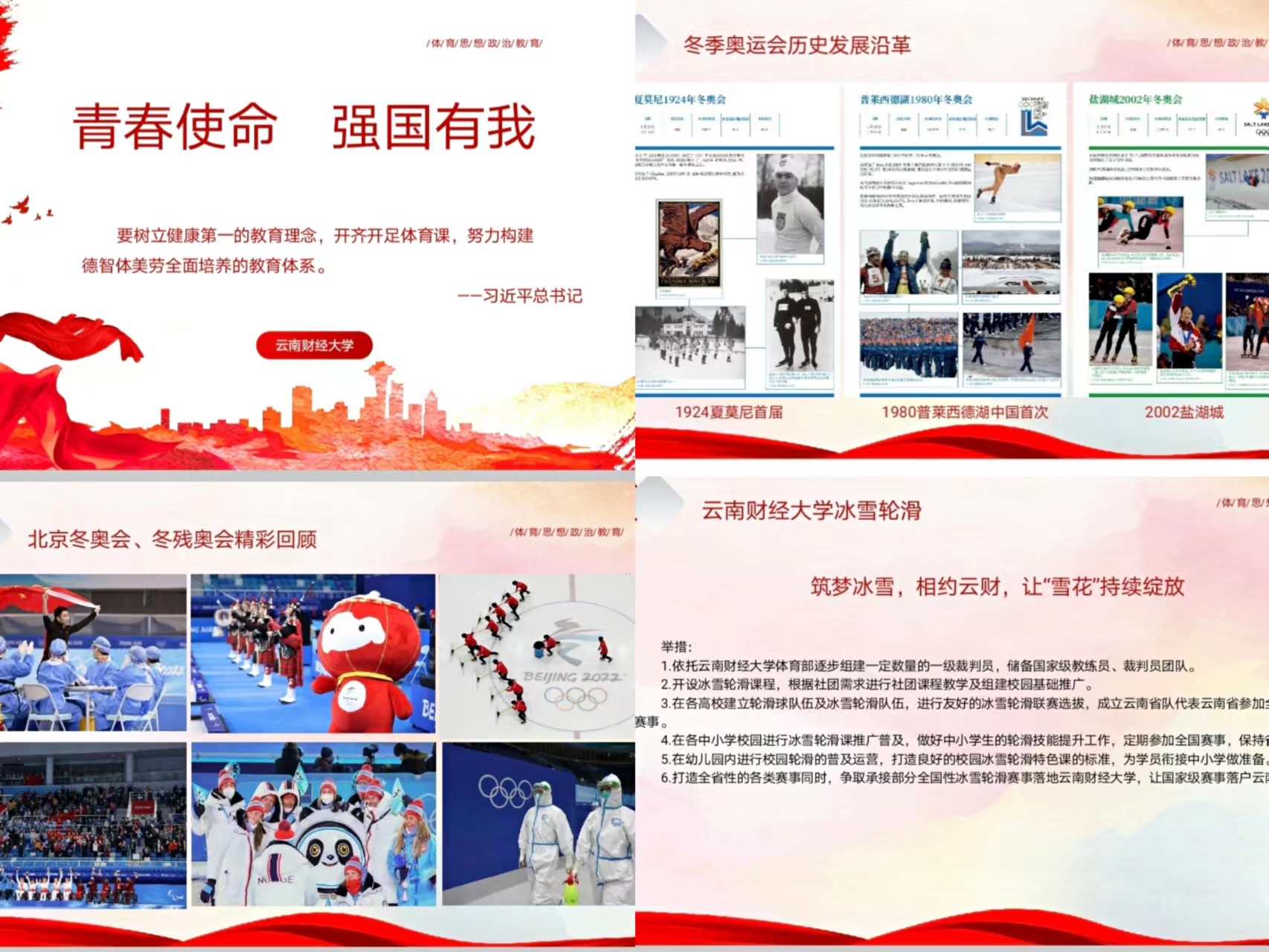 为学习贯彻习近平总书记在北京冬奥会、冬残奥会总结表彰大会上的重要讲话精神,落实《中共云南省委教育工委转发中共教育部党组关于学习贯彻习近平总书记给中国冰雪健儿重要回信精神的通知》要求,引导学生学习“胸怀大局、自信开放、迎难而上、追求卓越、共创未来”的北京冬奥精神,锤炼顽强拼搏、爱国奋进的意志品质,4月18日-22日,beat365利用体育课教学班级积极开展“青春使命 强国有我”专题体育思政教育。