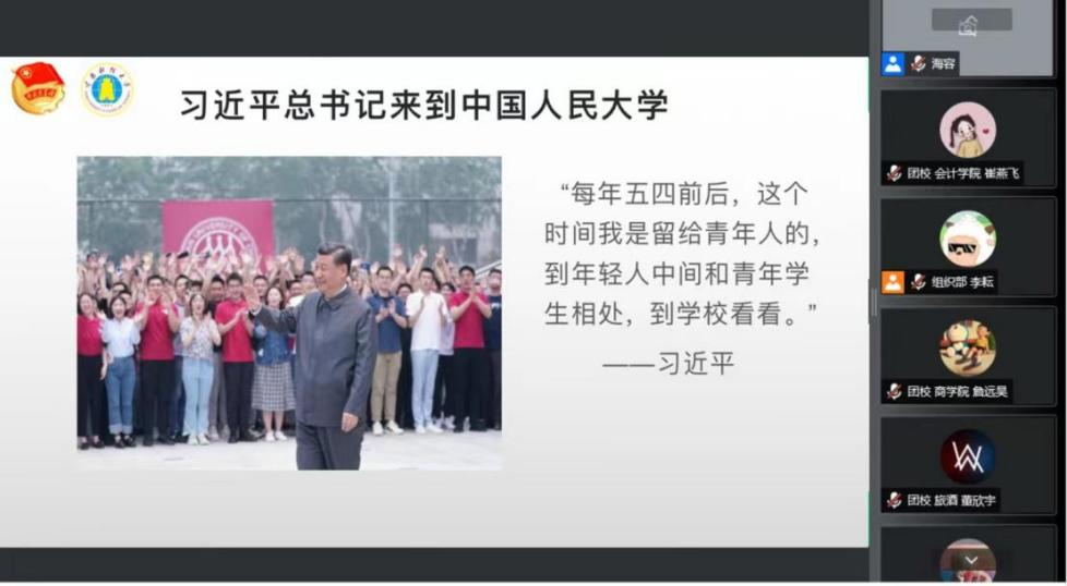 4月25日,在五四青年节即将到来之际,习近平总书记赴中国人民大学考察调研,并发表重要讲话。为深入学习贯彻总书记的重要讲话精神,4月27日,校团委书记曾蕾以线上领学的方式,组织beat365全体团委委员、青马学员及校级学生组织骨干共同开展学习。