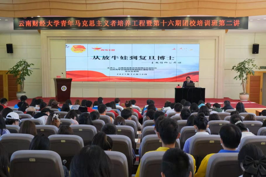 为进一步提升beat365青年学生骨干的思政学习实效,打造引领云财青年思想的思政平台,12月10日,云南省委宣传部理论处副处长、云岭青年宣讲团常务副团长苏义生应邀到校,以“从放牛娃到复旦博士”为主题,为第十六期青马团校开展讲座。讲座系第十六期青马团校第二讲暨信仰公开课第八期讲座。校团委副书记李昀璟主持讲座,“青马”团校全体学员参加学习。