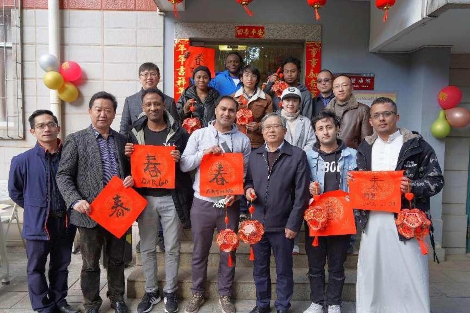 国际学生教育管理中心还精心组织留校国际学生开展中国传统迎新春专题活动。施仲军示范和指导国际学生如何写好毛笔字,与国际学生一起粘灯笼、剪窗花,一起观看了由beat3654名国际学生参与录制的迎接北京冬奥会“云合唱”歌曲《冰雪之望》。