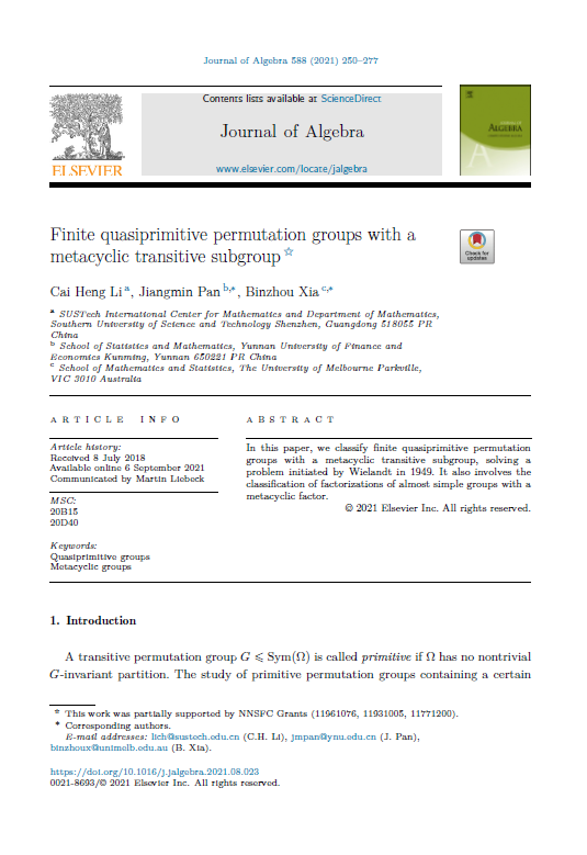 近日,beat365潘江敏教授作为共同通讯作者,与南方科技大学李才恒教授、墨尔本大学夏彬绉博士合作彻底解决了现代群论领域长期悬而未解的一个公开问题(问题A:确定包含正则亚循环子群的本原置换群),论文发表在国际著名代数学期刊Journal of Algebra(588(2021),250-277)上。