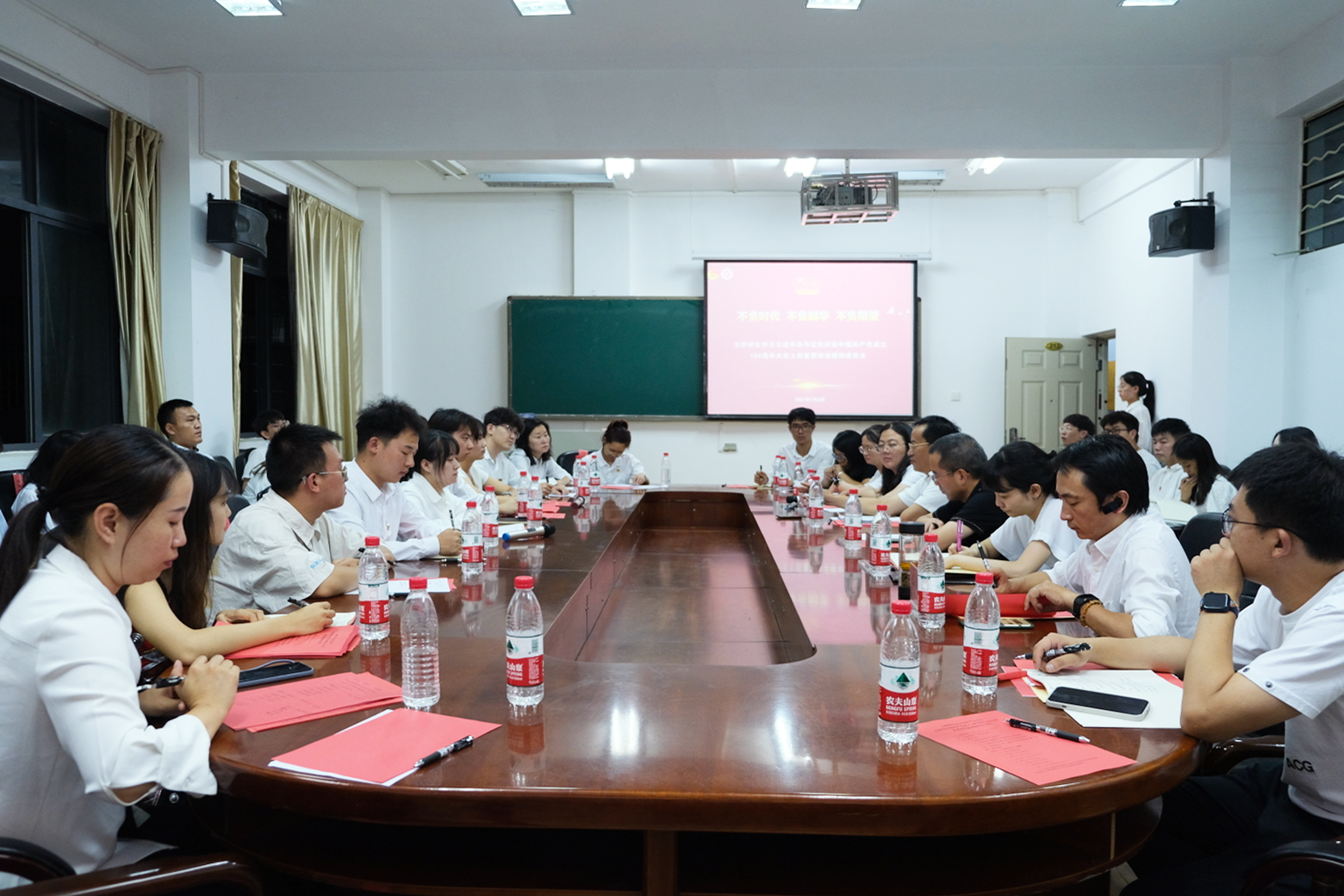 7月6日晚,beat365团学干部、学生代表在卓远楼213会议室举行座谈,集中学习习近平总书记在中国共产党成立100周年庆祝大会上的重要讲话精神,校党委副书记桂正华领学讲话精神并与学生代表交流座谈。