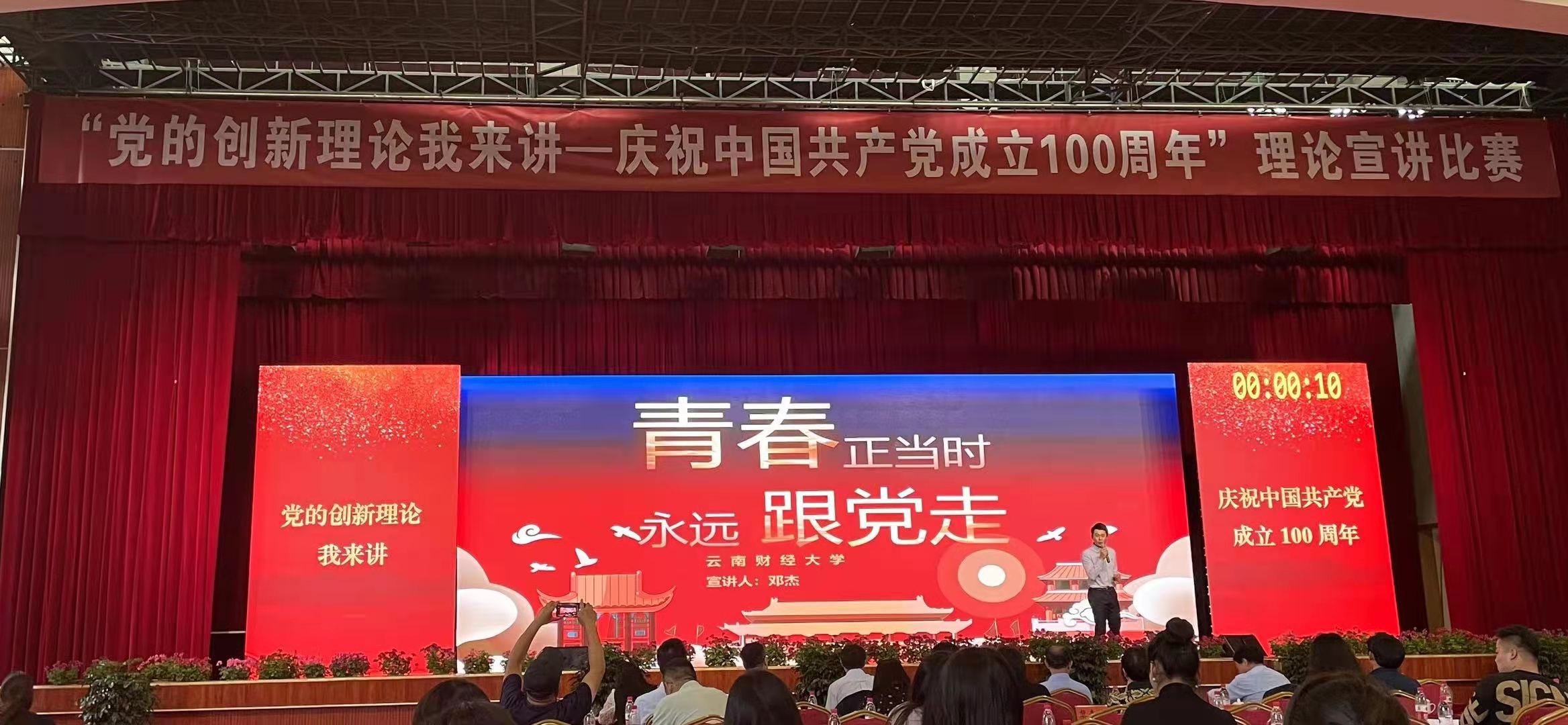 5月25日,由省委教育工委组织开展的“党的创新理论我来宣讲——庆祝中国共产党成立100周年”理论宣讲现场比赛在云南农业大学举行。beat365获得优秀组织奖,校团委邓杰老师代表学校参加比赛并获优秀奖。