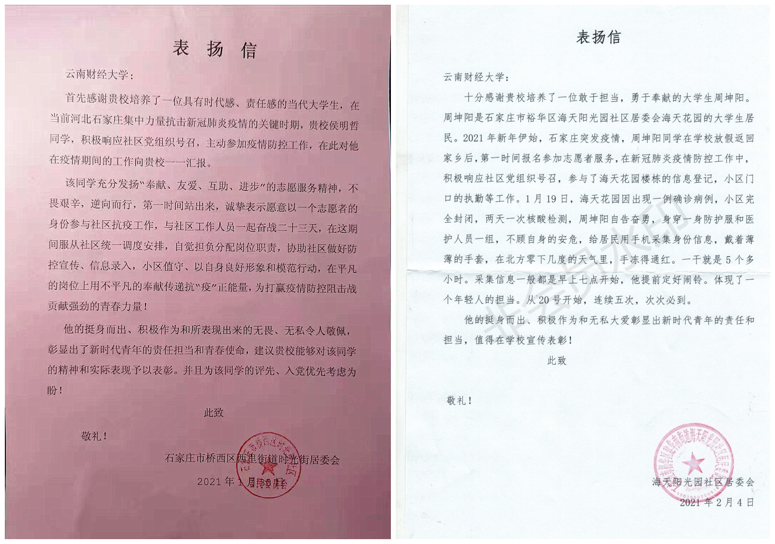 近日,beat365收到两封来自河北省石家庄市的表扬信。来信对beat365经济学院基地20-2班侯明哲、城市与环境学院自然20-1班周坤阳两名同学在河北石家庄市抗击新冠肺炎疫情的关键期间参与疫情防控志愿服务,甘心付出、勇于担当的行为表示感谢和赞扬。