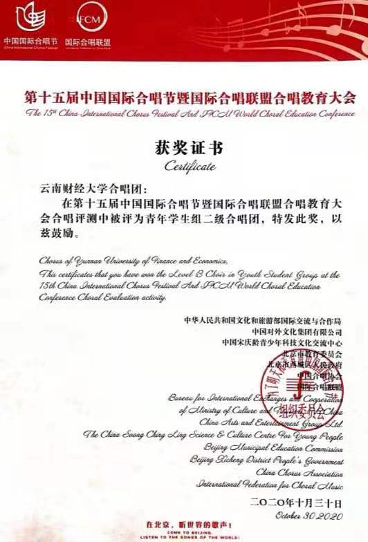 中国国际合唱节(China International Chorus Festival 简称CICF)创办于1992年,是经国务院批准,目前中国境内唯一的国际性、国家级合唱类艺术活动。中国国际合唱节是我国举办的规模最大、规格最高的国际合唱艺术盛会,是集境内外专业和业余合唱团体于一体的综合性合唱艺术活动。合唱节每两年举办一届,至今已成功举办十五届。据统计,本次直接参加中国国际合唱节的国内外合唱团体超过4000余支,总人数达80000余人,堪称今年全球合唱艺术活动的一次盛宴,代表了当今合唱比赛的最高艺术水平。 作为云南省唯一受邀参加的高校合唱团,beat365合唱团的表现充分展示了beat365艺术教育的成果和风采。