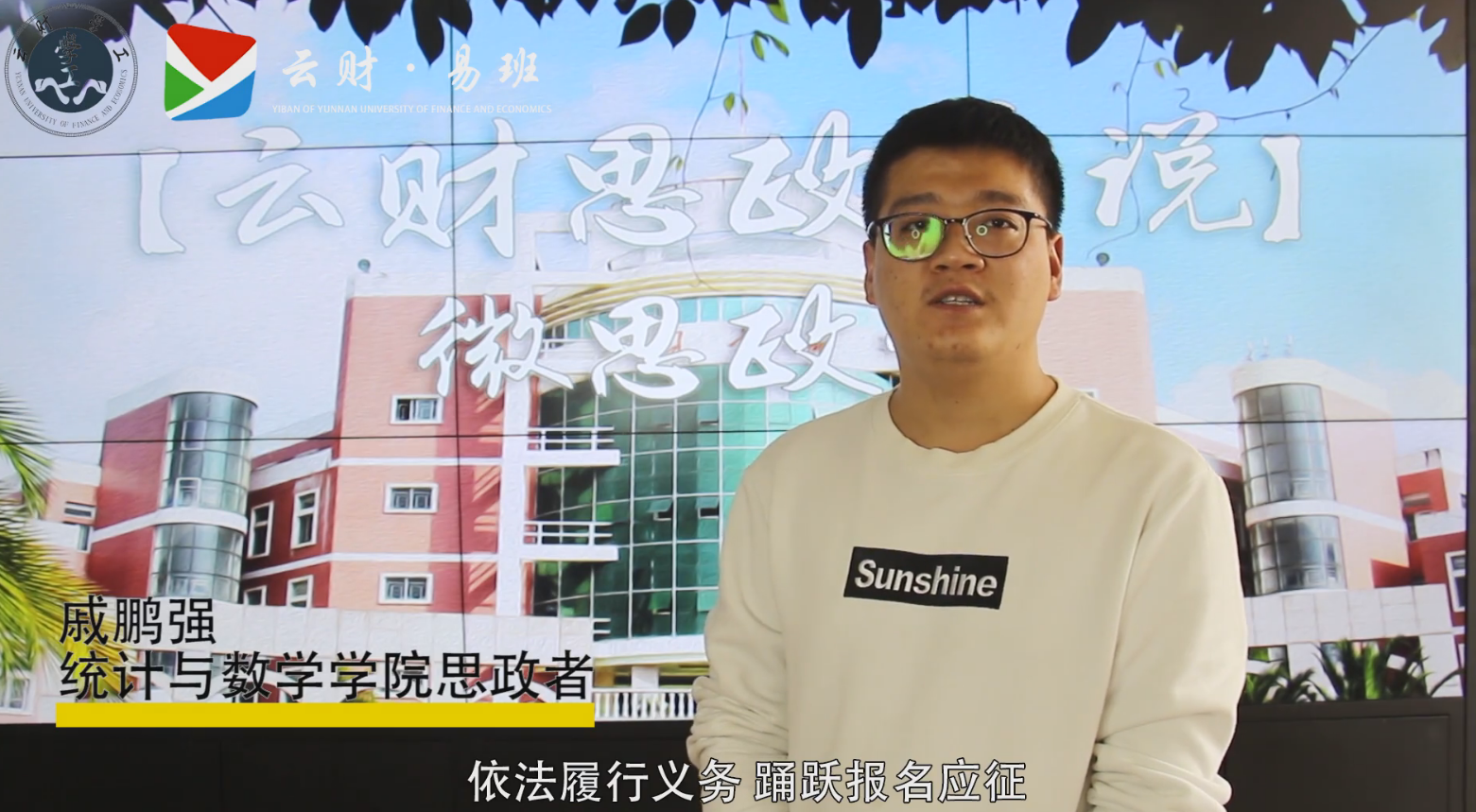 在第六期节目中,统计与数学学院辅导员戚鹏强以《听见国家的召唤,年轻人请答“到”》为题,介绍了参军入伍的国家优惠政策,解读beat365出台的各项鼓励措施,号召云财学子行动起来,志存高远,携笔从戎,踊跃报名参军,把拳拳爱国之心化为殷殷报国之行动。