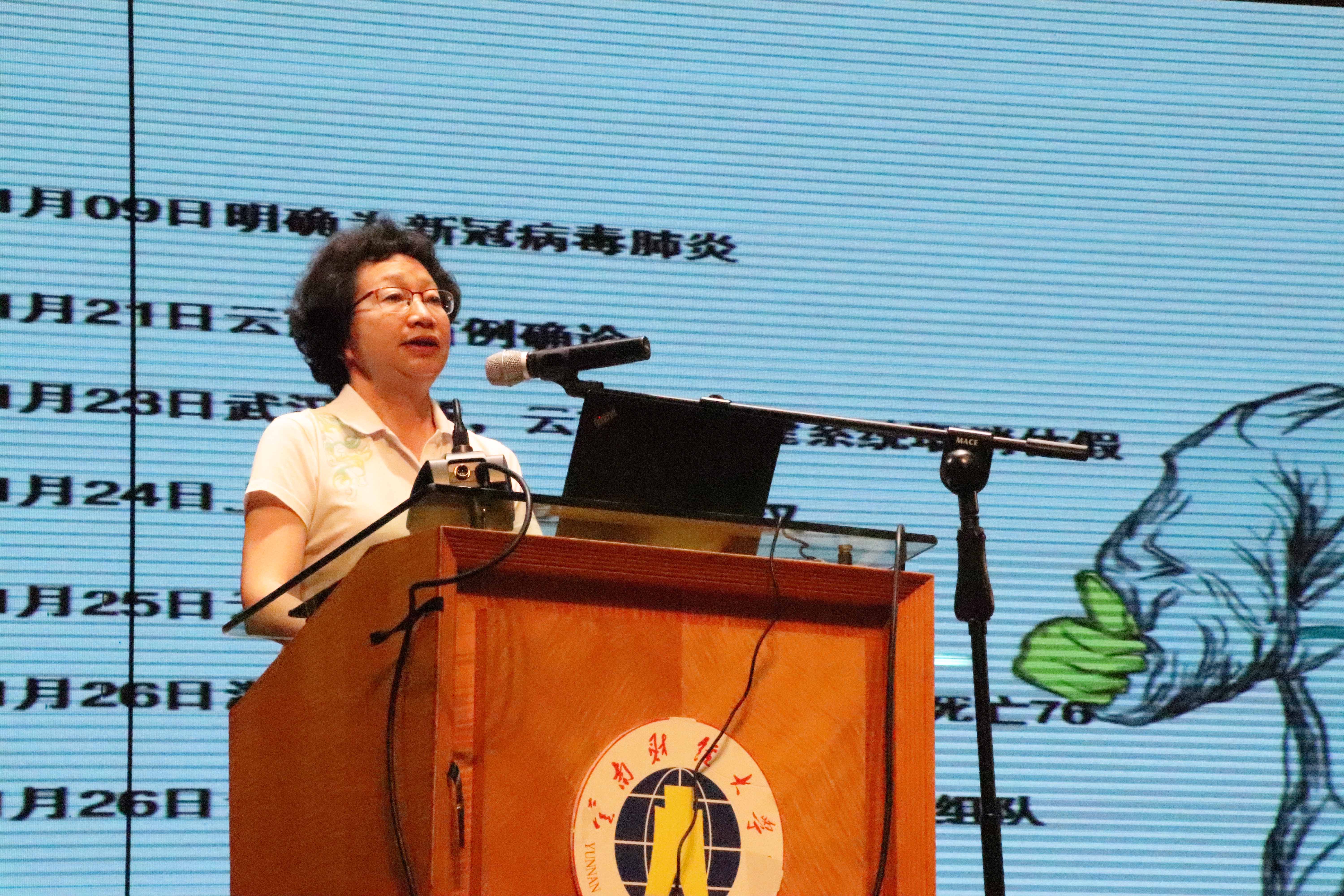 云南省第二人民医院副院长、第一批援鄂医疗队临时党总支副书记、副领队邓毅书以《毅然逆行,书写担当》为题,分享了她的抗疫故事。曾参加过“非典”和汶川救灾的邓毅书是一名经验丰富的呼吸科医生,面对疫情,即将退休的她毅然申请前去支援武汉。作为队里的“老大姐”,邓毅书发现138名“战友”中有三分之一都是90后,于是她暗下决心,无论多困难一定要把队员全部平安带回家。援鄂期间,邓毅书和队员们利用吃饭时间了解最新医疗措施,讨论治疗方案,开展从咸宁到昆明再到各县市三地的远程医疗会议,健全和完善了以优先治疗重症患者为主的战时医疗救治体系。“我就像一颗微不足道的沙粒,沉在2020抗疫历史的长河之中,虽然是那么的不起眼,但又是那么的心安宁,那么的自豪,为祖国自豪与骄傲。”邓毅书说。