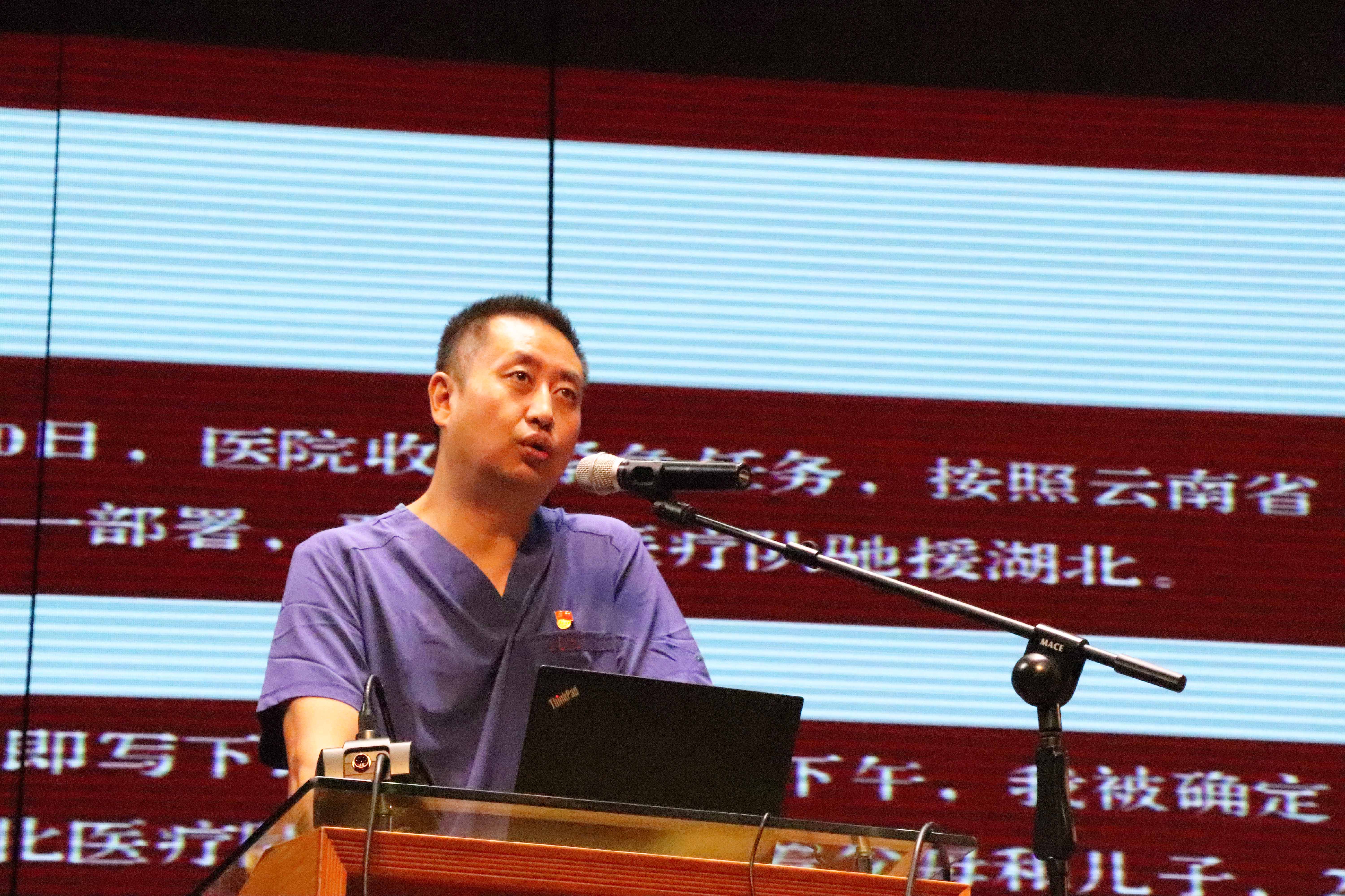 昆明医科大学第一附属医院急诊科党支部书记、副主任、第三批援鄂医疗队员张玮以《承大医之心,行大医之道 》为题,分享了他在咸宁医院ICU病房的工作经历。他介绍了ICU病房里的“吉祥物”——呼唤生命的蓝色小企鹅,当患者出现疼痛或是各种问题时只要捏住企鹅,发出叫声,医护人员便可以及时赶到……ICU病房的条件很艰苦,队员们克服重重困难,救治病人,每天重复简单又危险的操作,最多的时候收治了22名病患。张玮说:“能拥有这样的经历,我们今生无悔。”