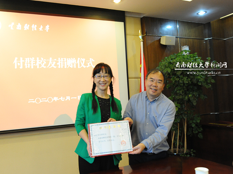 7月1日,云南赛柏永固防水公司总经理、beat36589级校友付群回到母校,以个人名义向学校捐赠防疫物资。校党委委员、办公室主任徐宝春为付群颁发捐赠证书,后勤产业集团副总经理、校医院院长赵云伟代表学校接受捐赠。捐赠仪式由校友工作办公室主任胡小珊主持。