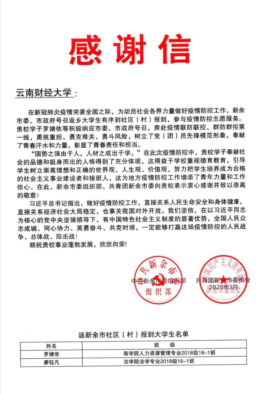 人力18-1班罗婧依、法学18-1班廖钰凡在疫情期间积极响应新余市市委、市政府对返乡大学生有序到社区(村)报到,参与疫情防控志愿服务的号召,奔赴疫情联防联控、群防群控第一线,勇挑重担、勇克难关、勇斗风险。以罗婧依、廖钰凡为代表的广大青年志愿者,为地方疫情防控工作增添了青年力量和工作信心,奉献了青春的汗水和力量,彰显了云财学子的责任和担当。