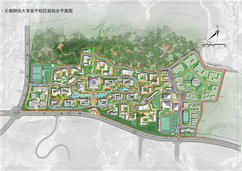 总平面图 校园全景 教学楼组团 景观桥 内环路 商业服务中心和食堂 水景 图书馆 宿舍组团 足球场