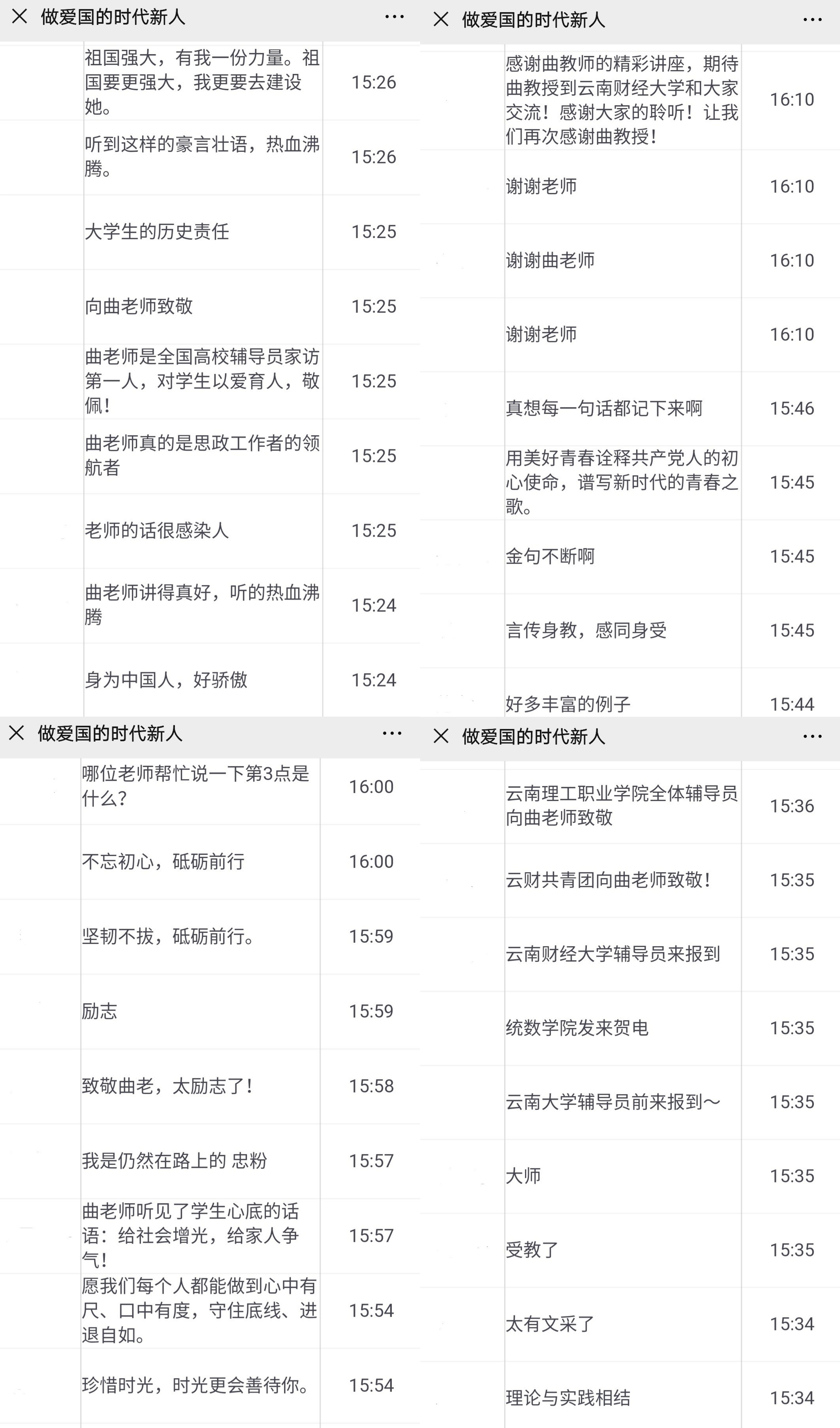 讲座过程中,师生们纷纷发弹幕表达了对讲座内容的喜爱。辅导员老师们表示要学习曲老师对学生的以爱育人,把小我融入大我,在实现社会价值中体现自我价值的责任和担当,不忘初心,砥砺前行,报效祖国。