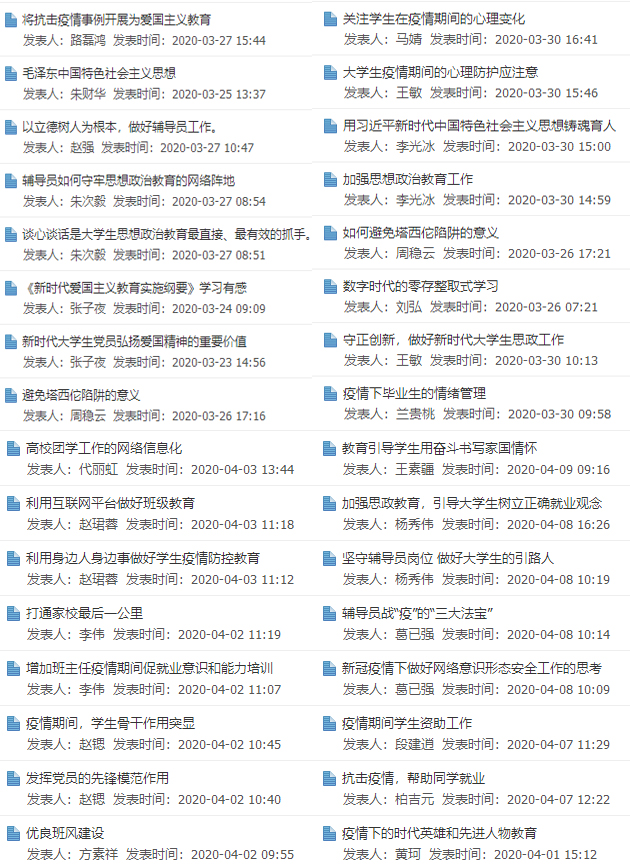 beat365辅导员积极参加培训学习,积极交流分享学习心得。截至目前,已有81人次发帖进行主题研讨,30余人次跟帖讨论,34名辅导员撰写学习心得。辅导员们主要围绕“疫情期间如何做好学生思想政治教育工作、如何加强疫情期间学生心理健康教育、如何有效加强班级管理、如何开展大学生理想信念教育和爱国教育、坚守辅导员岗位、新时代青年的责任与担当”等主题开展研讨学习。
