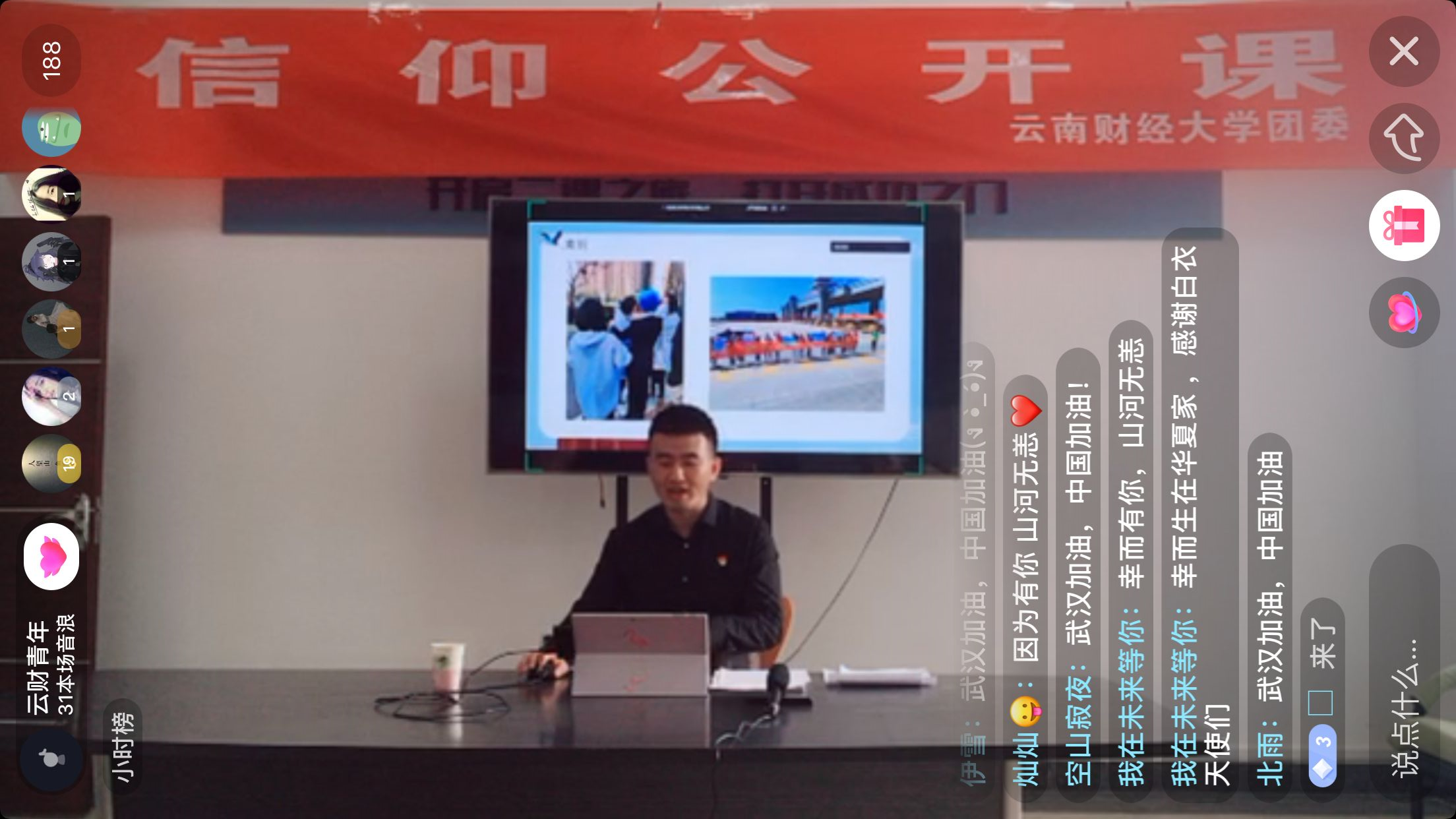 4月2日至6日,校团委以“走近新时代最可爱的人”为主题邀请到了刘永刚、方利洲、崔鹏宇等三位援鄂医疗队员,先后在腾讯会议、抖音直播等平台组织了三场线上“信仰公开课”,为同学们讲述抗“疫”故事,传递“最美逆行者”的拼搏精神。三期“信仰公开课”共覆盖全校16个学院的2千多名学生。
