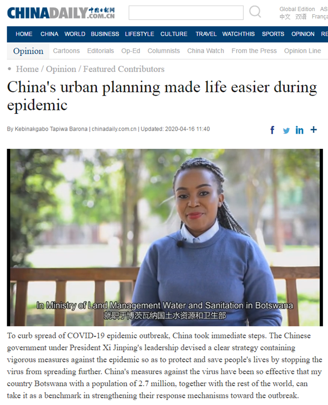 穆辉来自津巴布韦,是该国环境、旅游和酒店部官员,《COVID-19 outbreak proves China tackles challenges head-on》一文表达了对中国政府在新冠肺炎疫情期间面对挑战所体现的动员力量和组织能力的个人见解。来自博茨瓦纳国土资源管理部官员赵柔娜的文章《China's urban planning made life easier during epidemic》则肯定了中国在城市规划和基础设施建设方面所做的努力,对中国政府在危机应对方面的能力和优势表达了赞许。