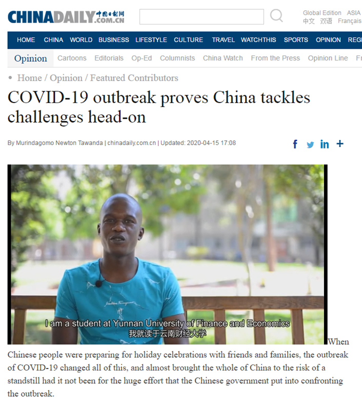 4月16日,中国日报网英文版“观点”栏目全文刊登了beat365商务部发展中国家硕士学历学位项目留学生Murindagomo Newton Tawanda(中文名穆辉)和Kebinakgabo Tapiwa Barona(中文名赵柔娜)的文章。两篇文章结合各自的经历,深入浅出地表达了对此次中国抗疫举措的看法并从专业的角度进行了分析。