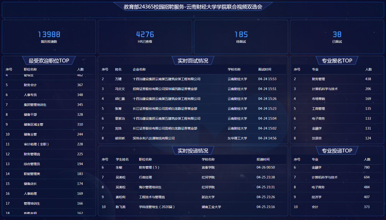 4月24日上午,由招生与职业发展中心主办,商学院、会计学院、金融学院、财政与公共管理学院联合承办的首场学院联合视频双选会在学校北院众创空间路演大厅举行。261家优质用人单位共提供就业岗位801个,招聘需求人数10280人,共3908名求职者报名,涉及18个专业。视频双选会现场浏览量27282人次,投递简历13988份,HR查阅简历4276份,面试38人,待面试185人,许多毕业生与用人单位达成了用工意向。