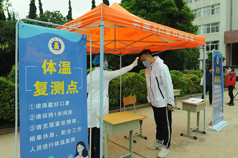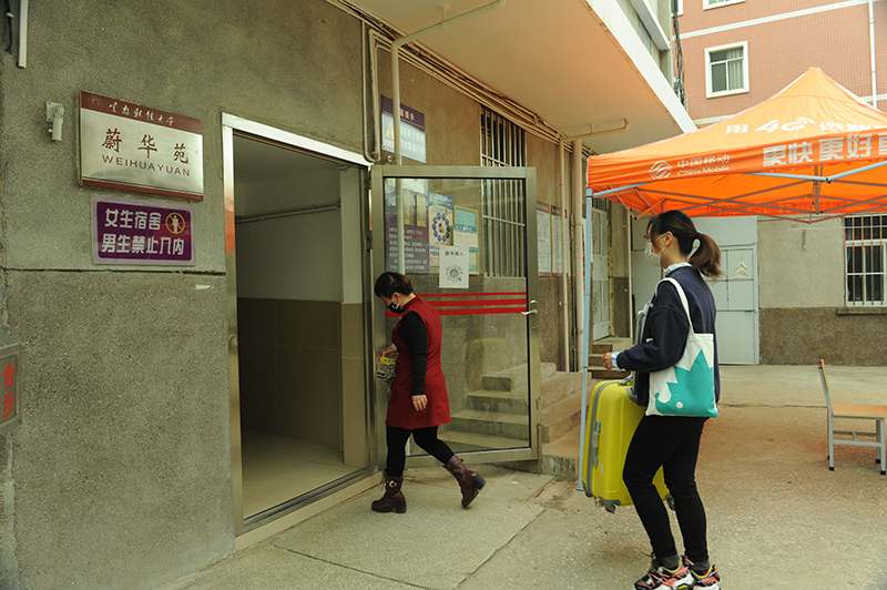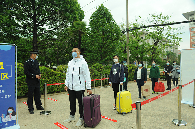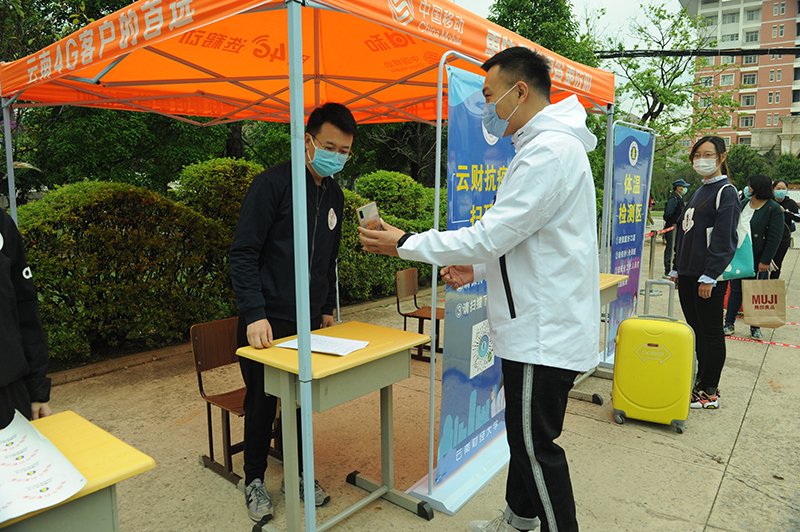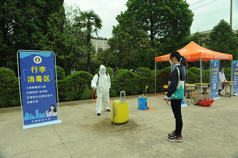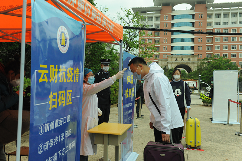 上午的疫情防控应急演练以模拟学生返校报到为背景,参加演练人员根据疫情防控期间学生错峰错时返校流程、学生健康异常情况应急处理流程及突发事件处理的相关要求进行演练。上午9:00,演练正式开始,扮演同学的老师们戴着口罩,在工作人员的引导下进入位于学校南院逸远楼前的演练现场,按照地上的提示线排好队,严格按照“一测二核三发四消五入住”报到流程进行返校报到。“一测”即测量体温,“二核”即核查“云财抗疫情”二维码,“三发”即发放校徽及“欢迎小云彩回家”标志,“四消”即行李消毒,“五入住”即引导学生到公寓楼下,再次测量体温、查验身份无误后进入公寓。在演练中模拟设置了学生报到进校时的各类突发状况以及在公寓内出现的特殊情况。