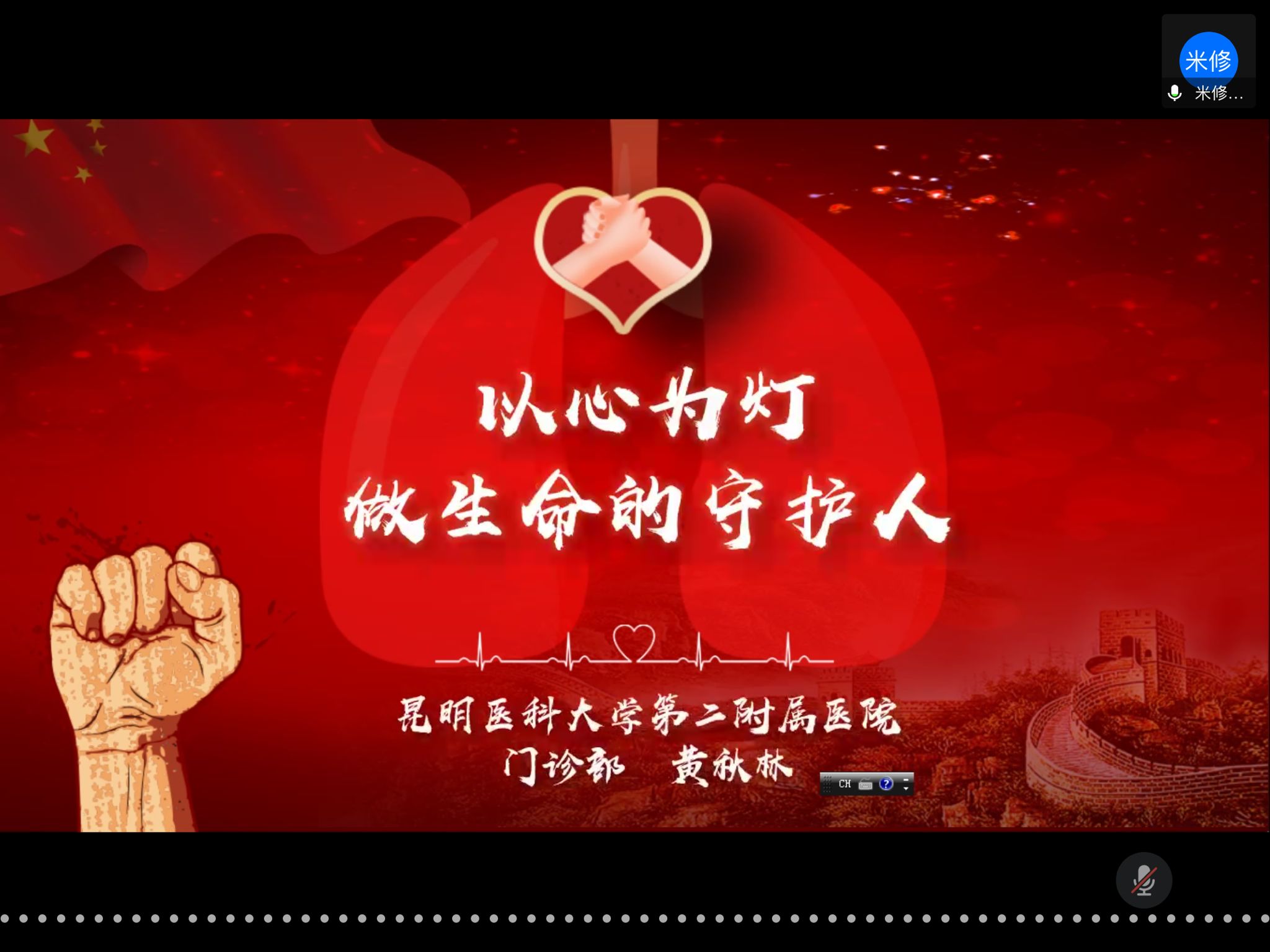 获得云南省卫健委嘉奖及三等功奖励的云南省第一批援鄂医疗队队员、医院护理组副组长黄秋林护师用“以心为灯,做生命的守护人”为主题,讲述了云南医护团队抵达湖北后争分抢秒做培训,第一时间进入到重症病房的经历。云南医护人员克服语言障碍,积极做好患者的医护和心理疏导工作,最终得到了患者的支持与感谢,也圆满完成了工作任务。