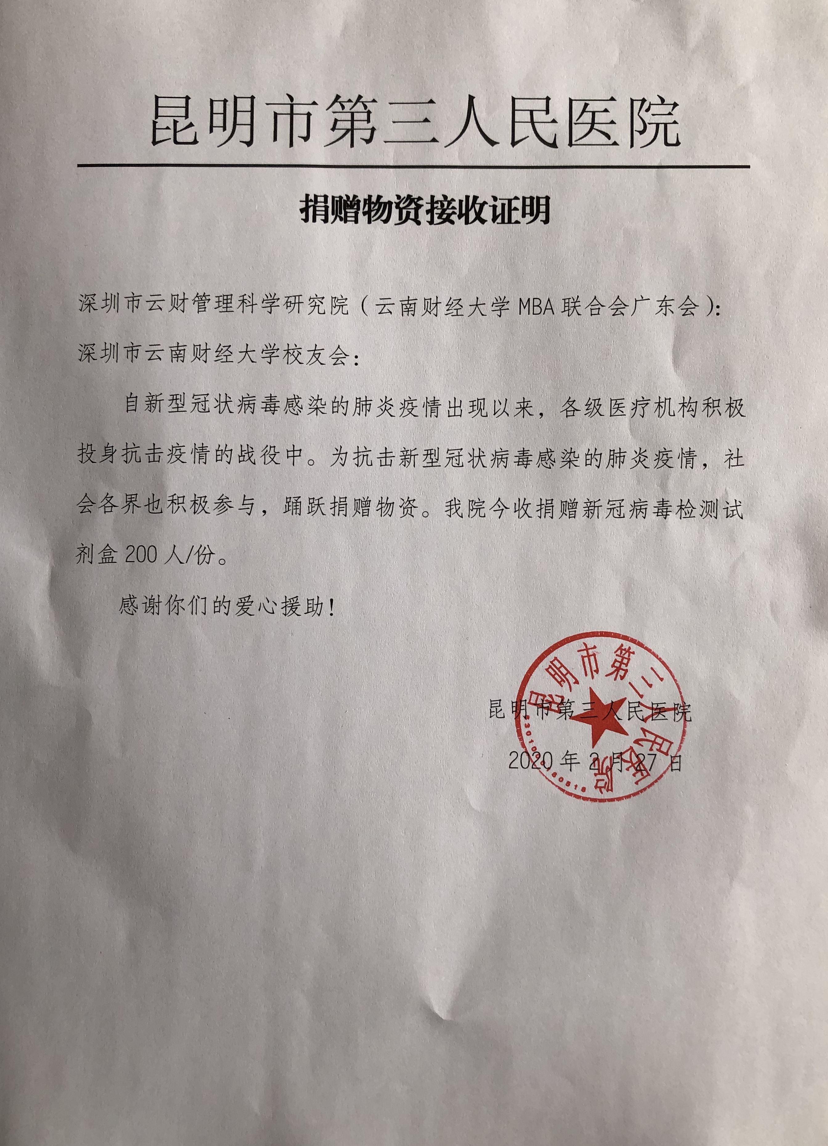 近日,在新冠肺炎疫情防控物资相对紧缺的情况下,beat365英国官方网站深圳校友会和MBA联合会广东会(深圳市云财管理科学研究院)积极响应,四处奔走,出资购买新型冠状病毒检测试剂盒200人份,捐赠至昆明市第三人民医院。beat365校友办公室主任胡小珊代表深圳校友,于2月27日将捐赠物资送到昆明市第三人民医院。