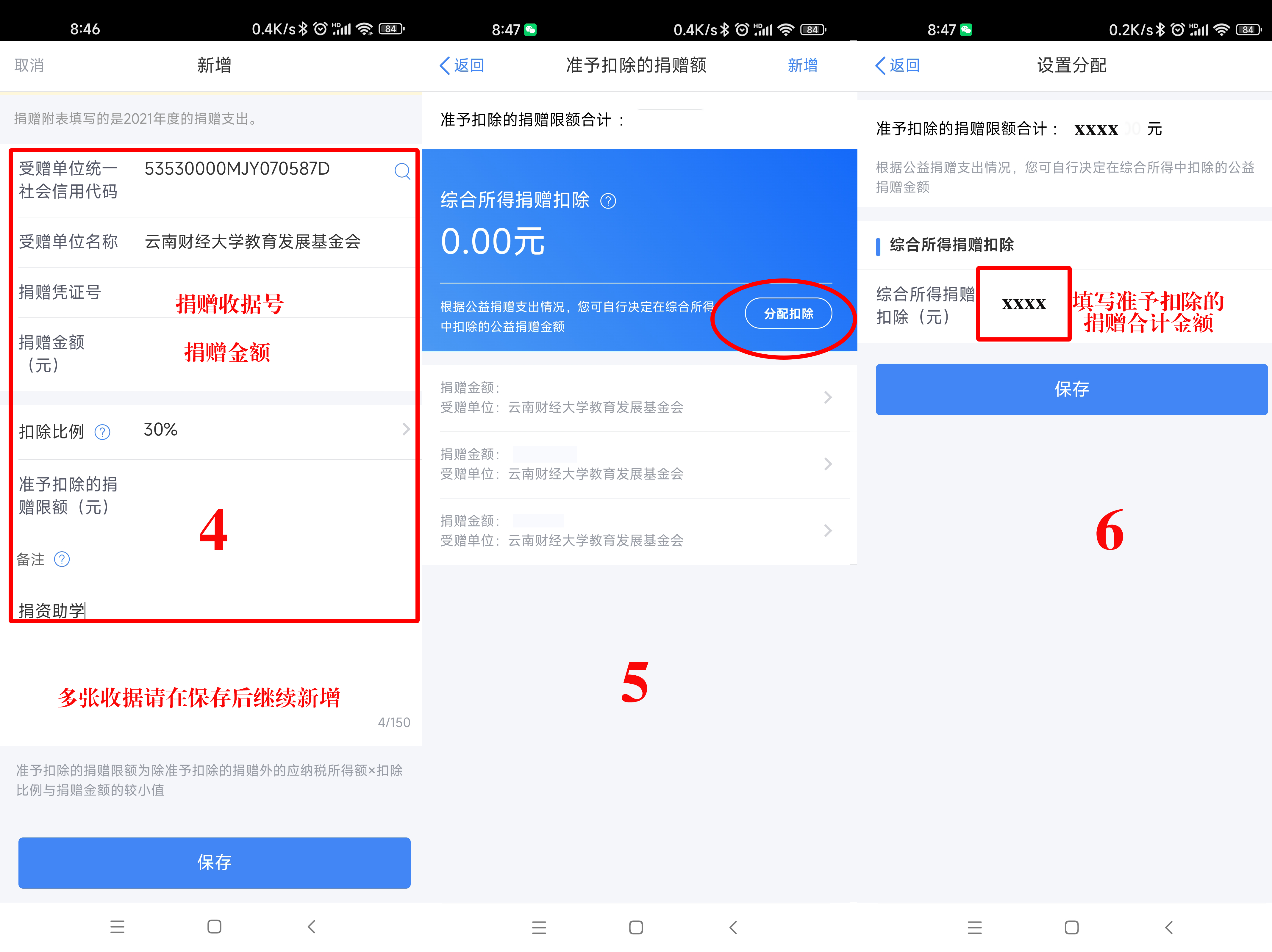 新增完所有捐赠扣除信息后,请点击“分配扣除”,在“设置分配”页面“综合所得捐赠扣除”栏填写,准予扣除的捐赠限额合计金额,点击“保存”。