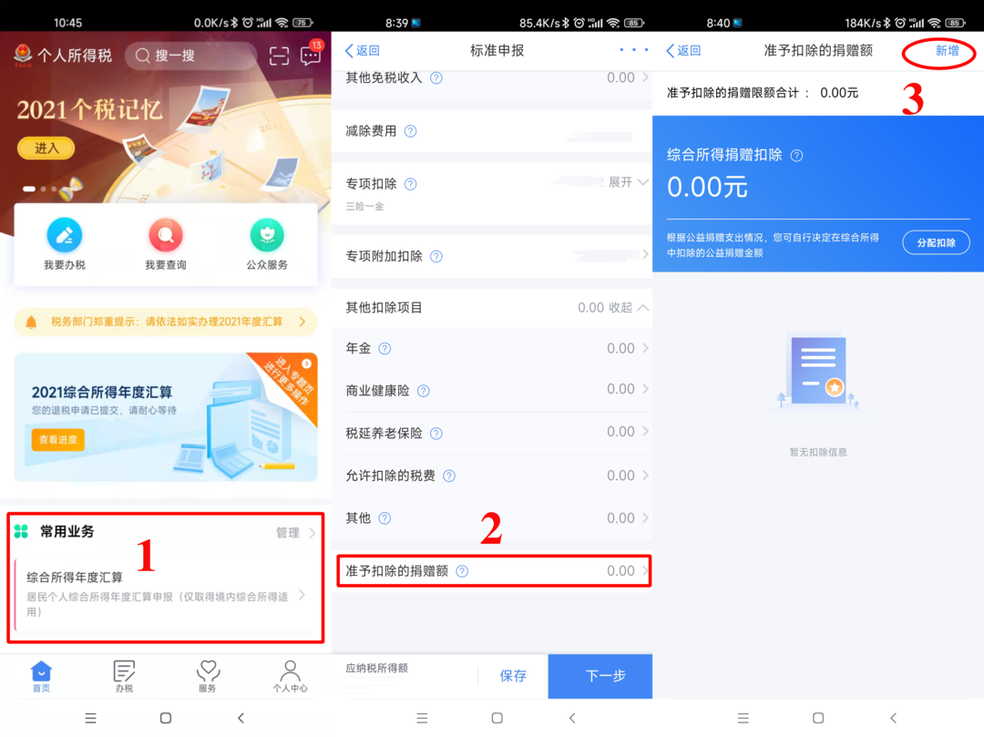 进入个人所得税APP首页,在【常用业务】栏目点击【综合所得年度汇算】进入,找到“准予扣除的捐赠额”点击进入,点击“新增”。