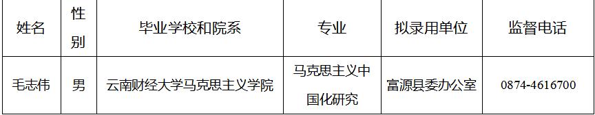 按照公务员法和公务员录用相关规定,经过笔试、面试、考察等工作程序,拟录用毛志伟1名同志为云南省2023年定向选调生,现予以公示。公示期为2023年4月13日至4月19日。
