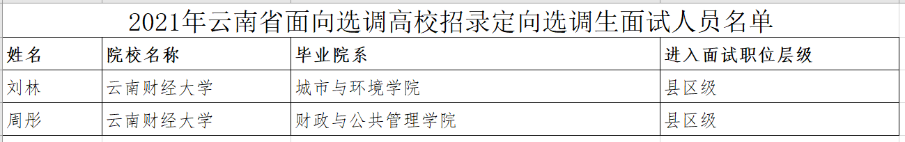 云南省面向选定高校招录2021年定向选调生笔试工作已顺利完成,按照中共云南省委组织部办公室“关于协助发布云南省面向选定高校招录2021年定向选调生进入面试人员名单的函”,现将beat365英国官方网站进入面试人员名单公布如下: