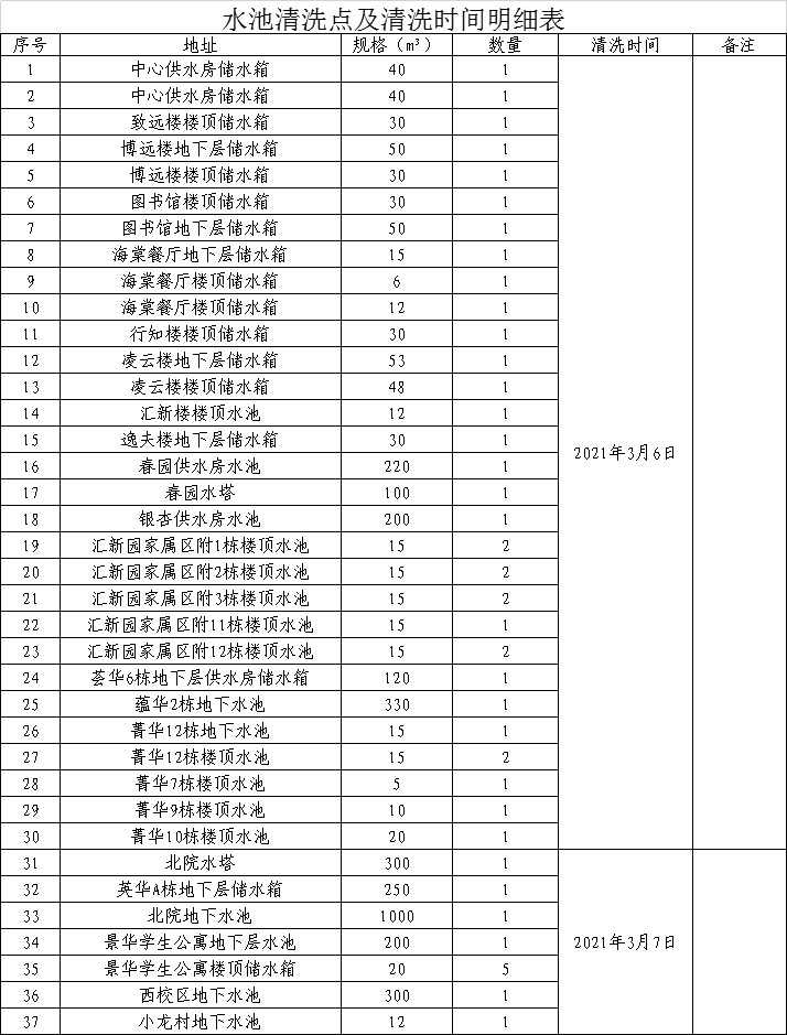 为确保学校二次供水储水池水质符合国家卫生防疫安全标准,按照《生活饮用水卫生监督管理办法》、《生活饮用水集中式供水卫生规范》要求,后勤产业集团物业部设备运行中心将于2021年3月5日22:00至7日23:00配合专业清洗公司对学校学生生活区域、学生餐厅、南院中心供水房、北院供水池、水塔、校内家属区等主要储水池(箱)进行清洗、消毒,清洗期间会出现停水,请做好储水准备,由此带来不便,敬请谅解!