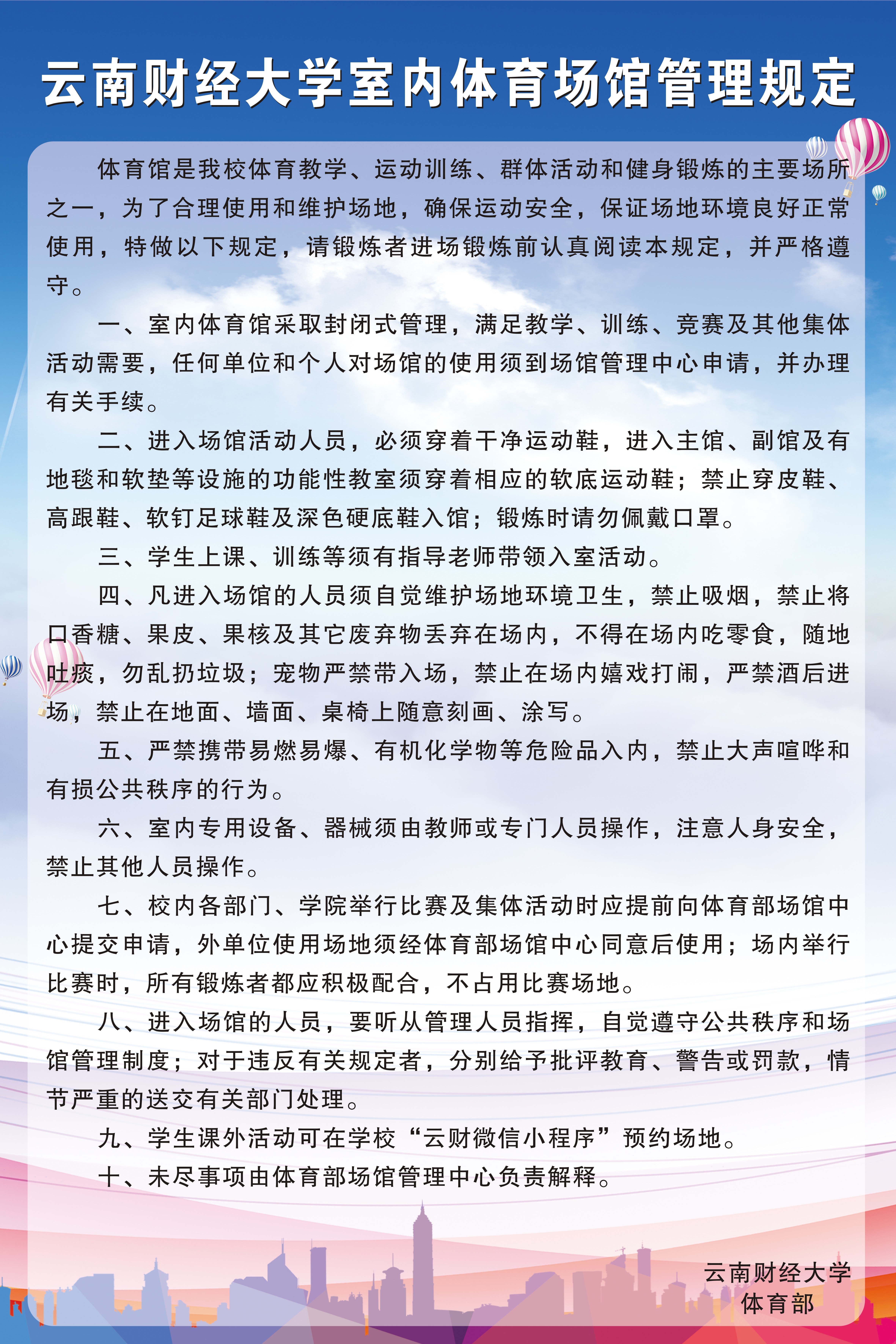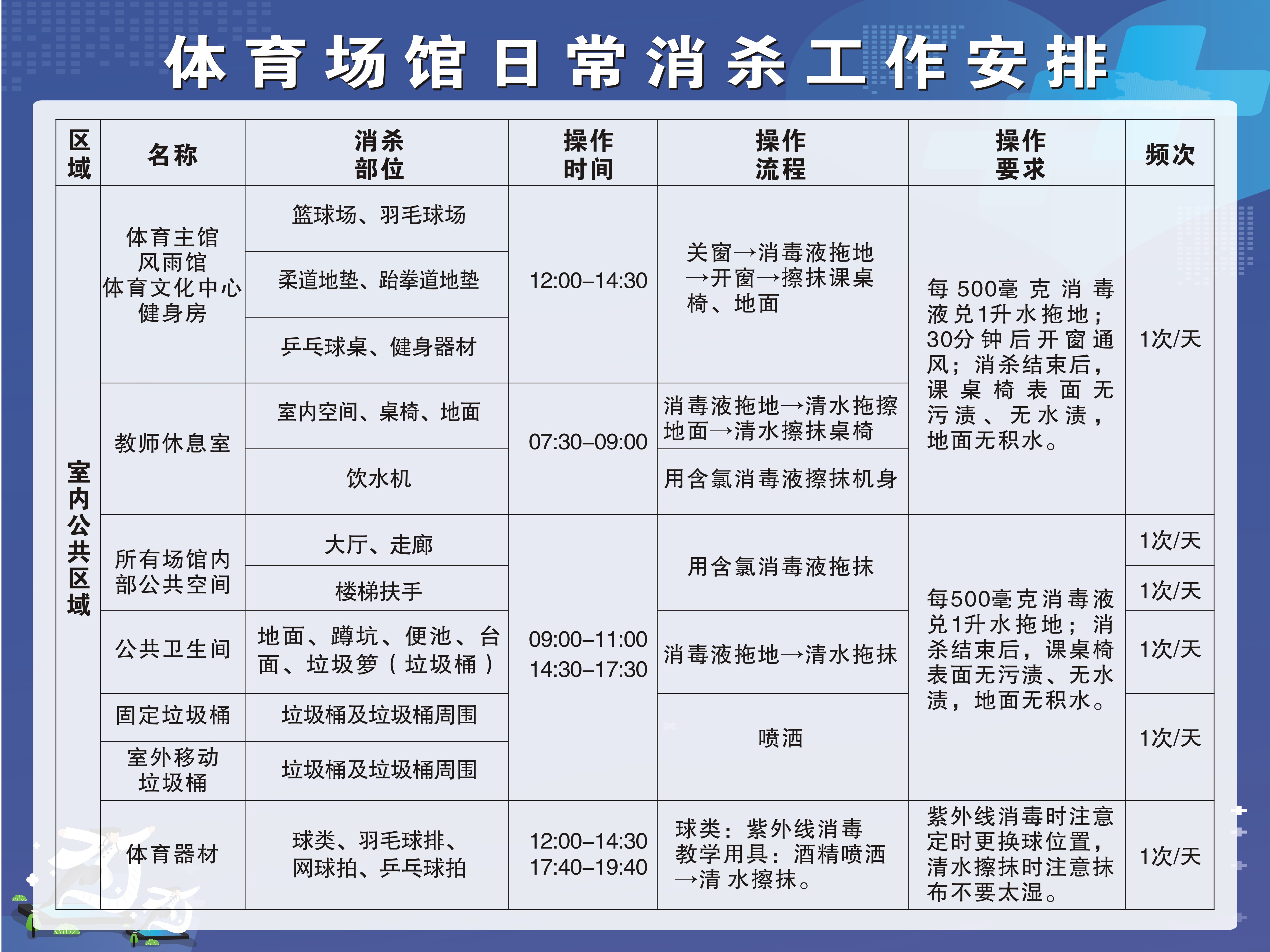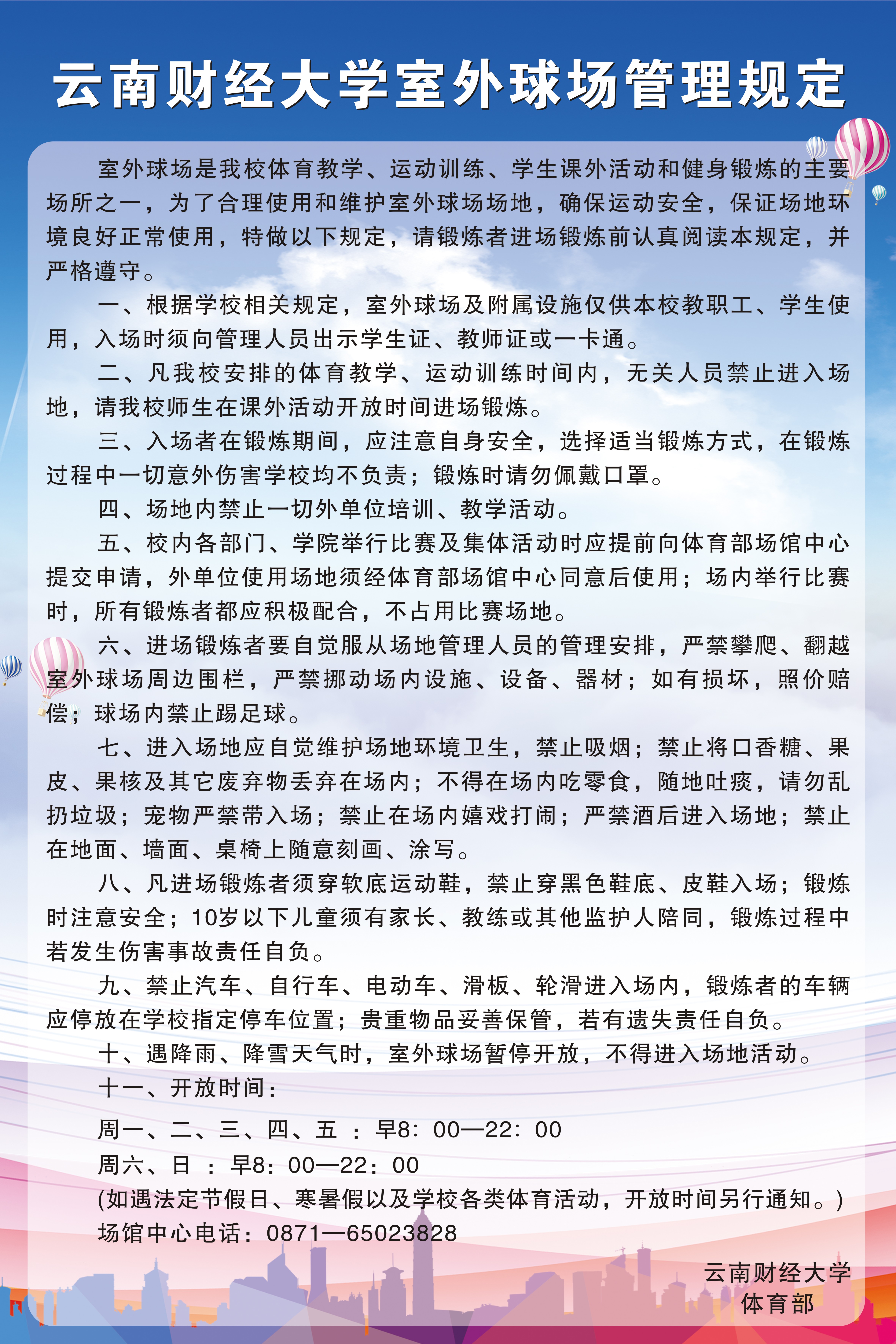 学校体育场馆、体育器材每天在教学、课外活动结束后都安排专人进行消杀,请老师同学们放心使用,服务监督电话:0871—65023828。