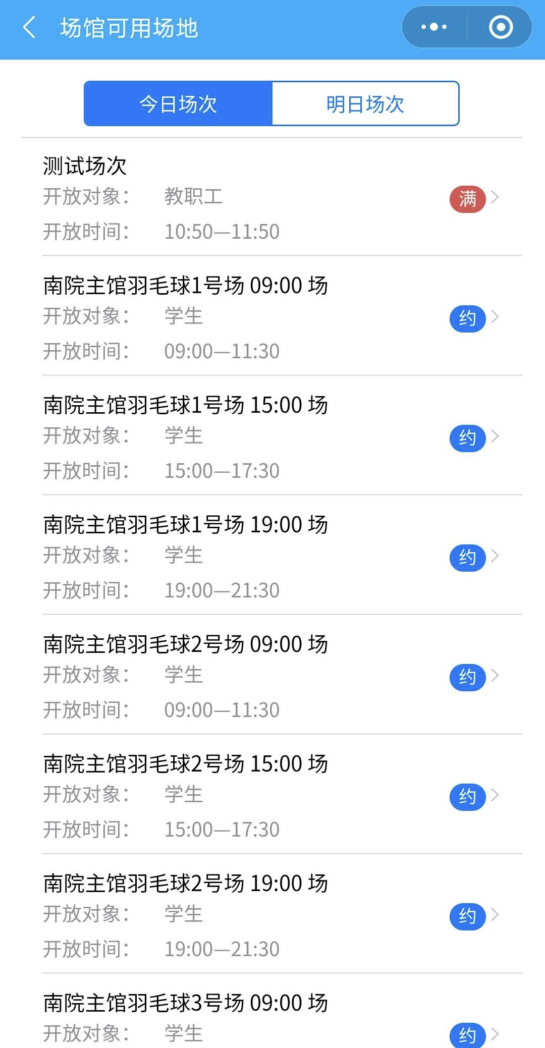 第三步,点击相应的体育场馆名称,查看可预约场次页面。注意:场次预约情况随时在变化,用户可在下拉刷新该页面,查看最新的预约情况。如下图所示: