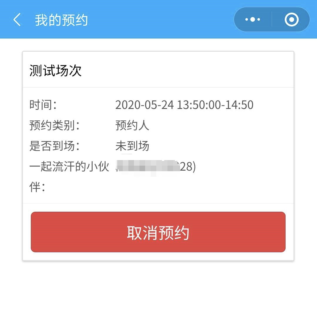 第五步,预约完成后,可在“我的预约”页面中查看预约详情,如需要取消预约,点击“取消预约”按钮即可取消。注意:如已预约的场次因个人原因不能按时到场,应及时取消预约,将场地留给其他需要使用的老师或同学。如有2次以上预约场地后,不到场且未取消预约,将在1个月内禁止预约场地。如下图所示: