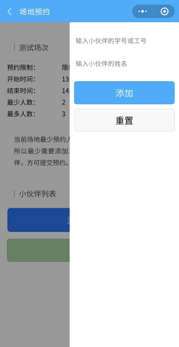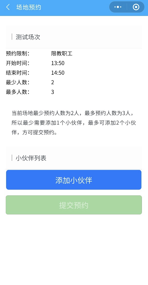 第四步,点击需要预约的场次,进入场次预约。不同的场次,有不同的预约人数限制,需要点击“添加小伙伴”按钮,添加满足要求的同行人后,方可提交预约。如下图所示: