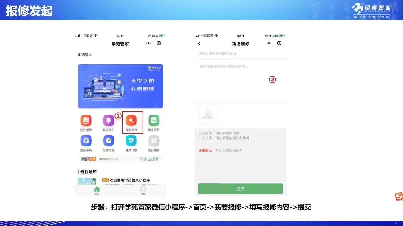 通过“学苑管家”微信小程序报修。具体操作如下: