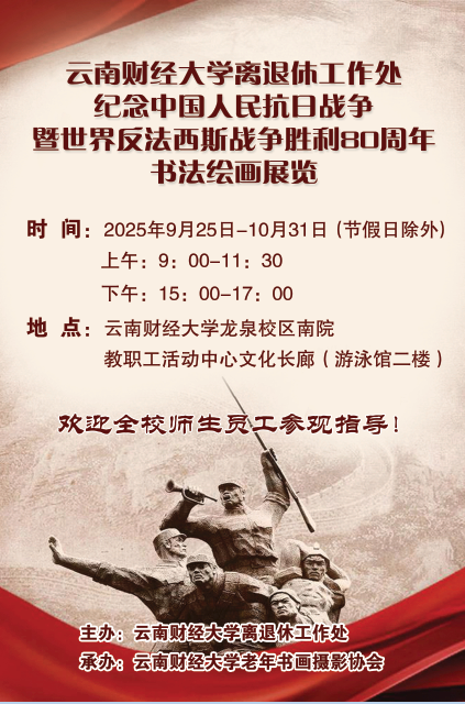 今年是中国人民抗日战争暨世界反法西斯战争胜利80周年。为深切缅怀革命先烈的丰功伟绩,大力弘扬伟大抗战精神,厚植师生爱国情怀,引导师生铭记历史、珍爱和平、砥砺奋进,由beat365离退休工作处主办、老年书画摄影协会承办的“纪念中国人民抗日战争暨世界反法西斯战争胜利80周年书法绘画展览”将于近期举办。现将有关事项通知如下: