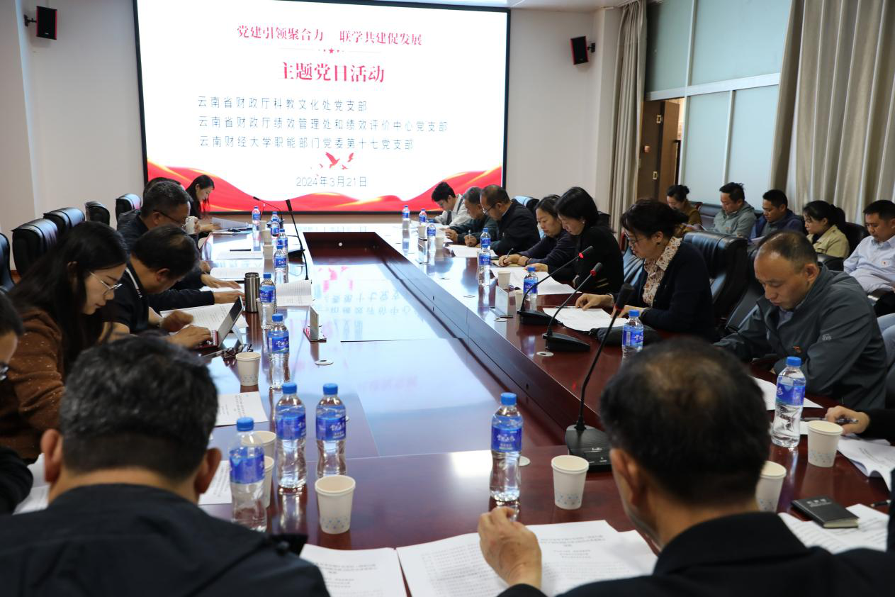 3月21日下午,云南省财政厅科教文化处党支部、绩效管理处和绩效评价中心党支部与beat365英国官方网站职能部门党委第十七党支部在龙泉路校区图书馆一楼会议室联合开展“党建引领聚合力,联学共建促发展”主题党日活动。校党委委员、副校长胡海彦同志和三个支部共30余名党员参加活动,活动由学校职能部门党委第十七党支部书记赵先志主持。