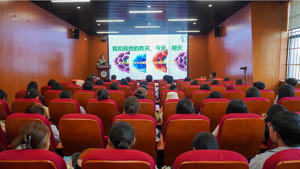 揭牌仪式后,丁兰英以“针线绣同心 ,巧手传非遗 ”为题,分享自己一路走来的创业发展经历,围绕“不忘来时路”“踏实脚下路”“坚定未来路”三个部分,生动地讲诉了20年来植根楚雄乡土沃野,传承保护发展彝族刺绣并对其不断创新发展最终登上国际舞台的故事。“要发展彝绣,必须坚守文化自信,既保持传统彝绣的精髓,又不断创新发展,让彝绣走出‘深闺’,趁势出圈,积极打造彝绣产业链,深挖民族服饰背后的文化内涵和历史价值。”她表示,七彩彝绣扎根楚雄大地,且其始终坚守“不忘来时路,踏实脚下路,坚定未来路”的前进方向,走出了一条精品化艺术化的发展之路,希望之后在与传媒与设计艺术学院的合作推动下,一同将优秀民族文化及工匠精神更好地传承并发扬光大。