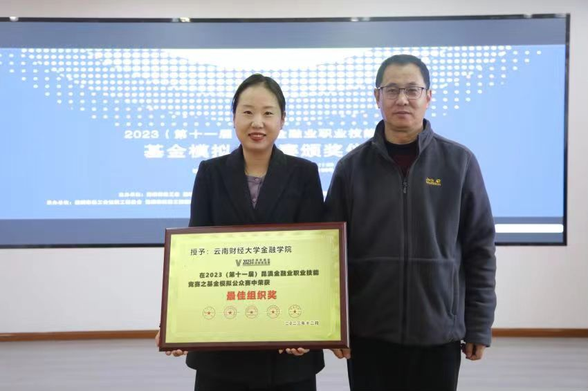 近日,2023昆滇基金赛颁奖仪式在昆明市新闻中心举行。在历时5个月的激烈竞赛中,beat365金融学院从众多高校队伍中脱颖而出,荣获“最佳组织奖”,学院陈楠、马小晴、郑伊凌、郑凯等4名同学跻身高校参赛者总榜的前五名。金融学院团委书记任琳代表学院参加颁奖仪式。