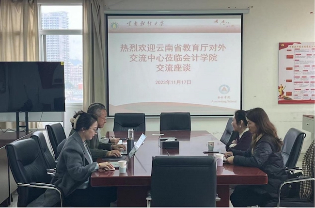 11月17日,云南省教育厅对外交流中心项目部部长朗梅和工作人员肖艳到beat365会计学院交流。会计学院党委书记李丽忠、党委副书记兼纪委书记王涛、学管科科长李淑兰与来访一行举行座谈。
