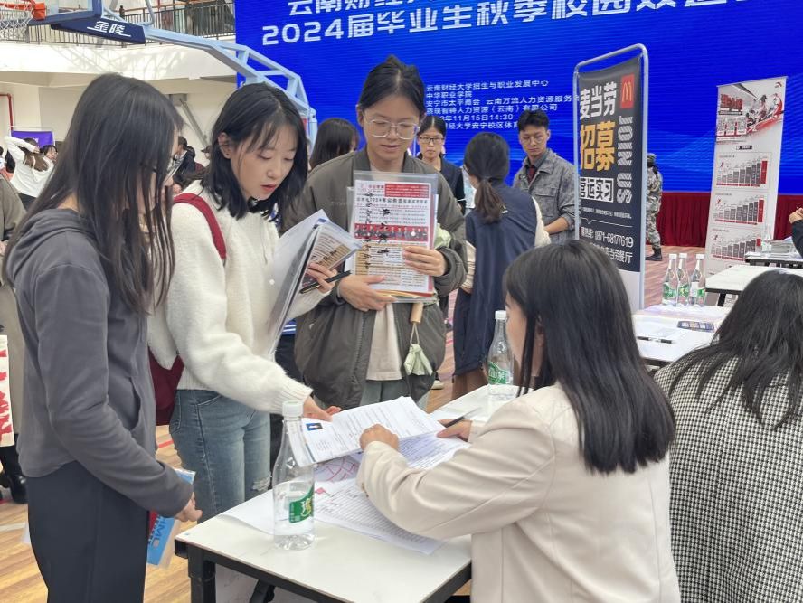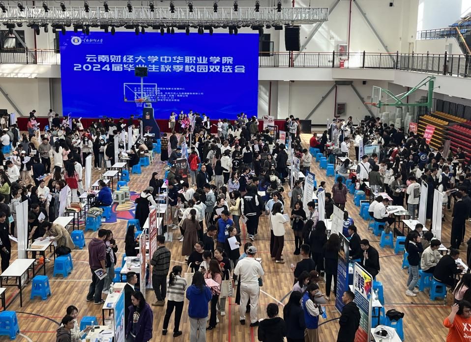 11月15日下午,中华职业学院在beat365英国官方网站安宁校区体育馆举办2024届毕业生秋季校园双选会。南京证券股份有限公司云南分公司、东方航空物流股份有限公司云南分公司、中国联通等124家企业到场招聘,提供就业岗位395个,招聘需求人数5499人。