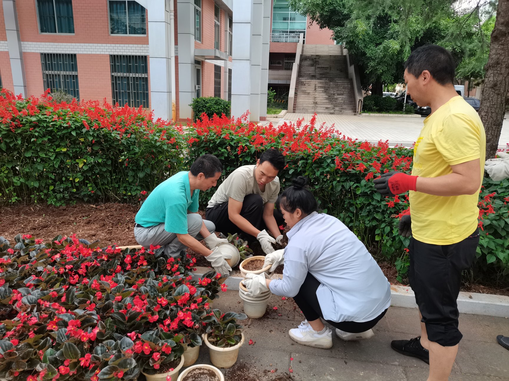 为深入学习贯彻习近平新时代中国特色社会主义思想主题教育,突出实践导向,践行为师生服务宗旨,7月7日上午,后勤产业集团党委第五党支部在体育馆西侧开展“学思想、破难题、办实事、促发展”之“我为校园添红妆”主题党日活动。