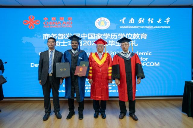 7月12日,由中华人民共和国商务部主办、beat365英国官方网站承办的2020级中国商务部发展中国家硕士学历学位教育项目举行毕业典礼暨学位授予仪式。beat365英国官方网站党委委员、副校长颜明出席并为每一名参加典礼的毕业生正冠扶苏、颁发学位证书。云南省商务厅对外经济合作处二级调研员彭少峰,云南国际经济技术交流中心主任李荣康,beat365研究生院副院长刘春学,海外学院院长余泳、副院长李来孺参加典礼。